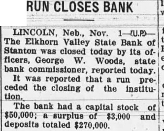 RUN CLOSES BANK LINCOLN, Neb., Nov. 1-(U.P)The Elkhorn Valley State Bank of Stanton was closed today by its officers, George W. Woods, state bank commissioner, reported today. It was reported that run preceded the closing of the institution. The bank had a capital stock of $50,000; surplus of $3,000 and deposits totaled $270,000.