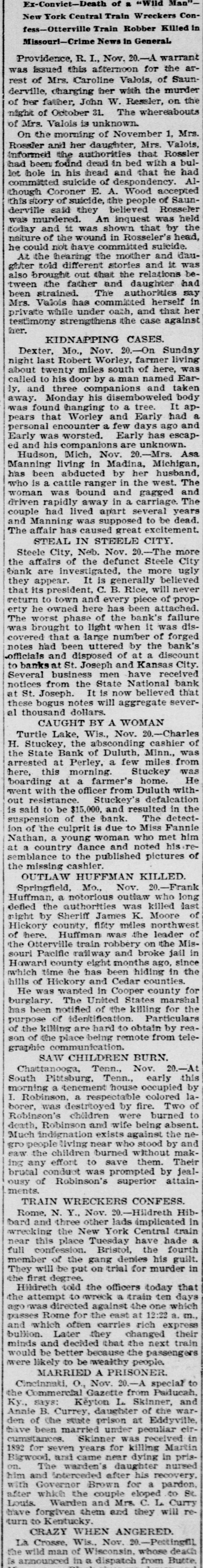 Er-Convict-Death of a "Wild Man"New York Central Train Wreckers Con fess-Otterville Train Robber Killed 1 Missouri-Crime News in General Providence, R. I., Nov. 20.-A warran was issued this afternoon for the ar rest of Mrs. Caroline Valois, of Saun derville, charging her with the murde of her flailiher, John W. Ressler, on th night of October 31. The whereabout of Mrs. Valois is unknown. On the morning of November 1, Mrs Rossler and her daughter, Mrs. Valois informed the authorities that Rossle had been found dead in bed with a bul let hole in his head and that he had committed suicide of despondency. Al though Coroner E. A. Wood accepted this story of suicide, the people of Saun derville said they believed Rossele was mundered. An inquest was hel today and it was shown that by the naiture of the wound in Rosseler's head he could not have committed suicide. At the hearing the mother and dau ghiter told different stories and it was also brought out that the relations be tween the father and daughter ha been strained. The authorities say Mrs. Valois has committed herself in private while under oath, and that he testimony strengthens the case agains her. KIDNAPPING CASES. Dexter, Mo., Nov. 20.-On Sunday night last Robert Worley, farmer living about twenty miles south of here, wal called to his door by a man named Ear ly, and three companions and taker away. Monday his disemboweled bod; was found hanging to a tree. It ap pears that Worley and Early had s personal encounter a few days ago and Early was worsted. Early has escap ed and his companions are unknown. Hudson, Mich, Nov. 20.-Mrs. Asa Manning living in Madina, Michigan has been abducted by her husband who is a cattle ranger in the west. The woman was bound and gagged and driven rapidly away in a carriage. The couple had lived apart several year and Manning was supposed to be dead The affair has caused great excitement STEAL IN STEELE CITY. Steele City, Neb. Nov. 20.-The more the affairs of the defunct Steele City bank are investigated, the more ugly they appear. It is generally believed that its president, C. B. Rice, will never return to town and every piece of prop erty he owned here has been attached The worst phase of the bank's failure was brought to light when it was dis covered that a large number of forged notes had been uttered by the bank' officials and disposed of at a discount to banks at St. Joseph and Kansas City Several business men have received notices from the State National bank at St. Joseph. It is now believed tha these bogus notes will aggregate sever al thousand dollars. CAUGHT BY A WOMAN Turtle Lake, Wis., Nov. 20.-Charles H. Stuckey, the absconding cashier o the State Bank of Duluth, Minn., was arrested at Perley, a few miles from here, this morning. Stuckey was boarding at a farmer's home. H went with the officer from Duluth with out resistance. Stuckey's defalcation is said to be $15,000, and resulted in the suspension of the bank. The detect ion of the culprit is due to Miss Fannie Nathan, a young woman who met him at a country dance and noted his re semblance to the published pictures of the missing cashier. OUTLAW HUFFMAN KILLED. Springfield, Mo., Nov. 20.-Franl Huffman, a notorious outlaw who long defied the authorities was killed las might by Sheriff James K. Moore o Hickory county, fifity miles northwes of here. Huffman was the leader o the Otterville train robbery on the Mis souri Pacific railway and broke jail in Howard county eight months ago, since which time the has been hiding in the hills of Hickory and Cedar counties. He was wanted in Cooper county for burglary. The United States marsha has been notified of the killing for the purpose of identification. Particular of the killing are hard to obtain by rea son of the place being remote from tele graphic communication. SAW CHILDREN BURN. Chattanooga, Tenn., Nov. 20.-A South Pittsburg, Tenn., early this morning a tenement house occupied by I. Robinson, a respectable colored la borer, was destributed by fire. Two o Robinson's children were burned to death, Robinson and wife being absent Much indignation exists against the ne gro people living near who stood by and saw the children burned without mak ing any effort to save them. Their brutal conduct was prompted by jeal ousy of Robinson's superior attain ments. TRAIN WRECKERS CONFESS. Rome. N. Y., Nov. 20.-Hildreth Hib bard and three other lads implicated in wrecking the New York Central train near this place Tuesday have hade 8 full confession. Bristol, the fourth member of the gang denies his guilt They will be put on trial for murder in the first degree. Hildreth told the officers today tha the attempt to wreck a train ten days ago was directed against the one which passes Rome for the east at 12:22 a. m. and which often carries rich express bullion. Later they changed their minds and decided that the next train would be better because the passengers were likely to be wealthy people. MARRIED A PRISONER. Cincinnaki, O., Nov. 20.-A special to the Commercial Gazette from Paducah Ky., says: Keyton L. Skinner, and Annie B. Currey, daughter of the war den of the state prison at Eddyville have been married under peculiar cir cumstances. Skinner was received in 1892 for seven years for killing Martin Blgwood, and came near dying in prison. The warden's daughter nursed him and interceded after his recovery with Governor Brown for a pardon after which the couple eloped to St. Louis. Warden and Mrs. C. L Curry have forgiven them and they will return to Kentucky. CRAZY WHEN ANGERED. La Crosse. Wis., Nov. 20.-Pettingfil the wild man of Wisconsin. whose deach is announced in a dispatch from Butte