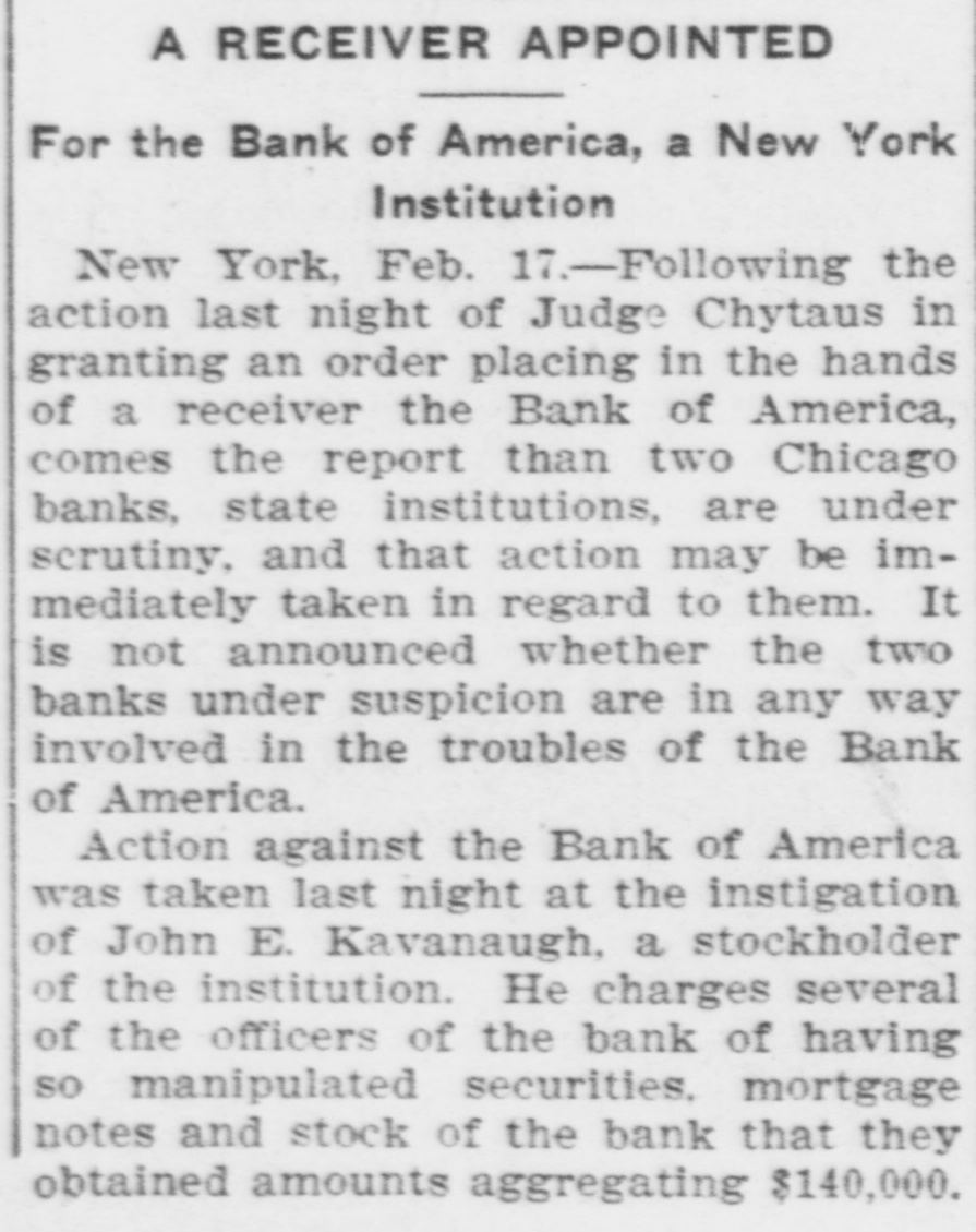 A RECEIVER APPOINTED For the Bank of America, a New York Institution New York, Feb. 17.-Following the action last night of Judge Chytaus in granting an order placing in the hands of a receiver the Bank of America, comes the report than two Chicago banks, state institutions, are under scrutiny, and that action may be immediately taken in regard to them. It is not announced whether the two banks under suspicion are in any way involved in the troubles of the Bank of America. Action against the Bank of America was taken last night at the instigation of John E. Kavanaugh, a stockholder of the institution. He charges several of the officers of the bank of having so manipulated securities. mortgage notes and stock of the bank that they obtained amounts aggregating $140,000.