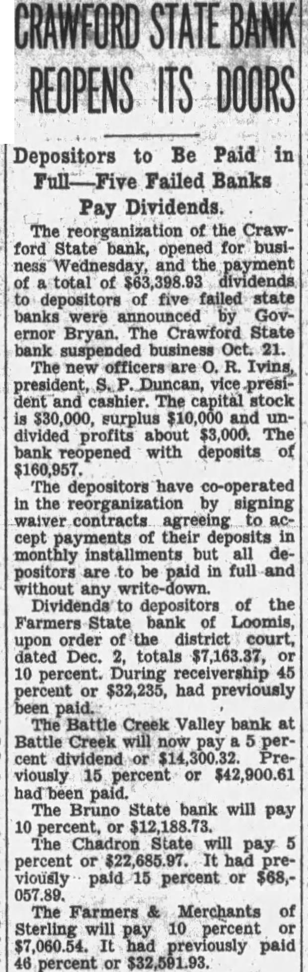 IN THE CONSIDERABLE BUSINESS DISPOSED OF THIS WEEK. Some Cases Settled Out of Petit Jury Excused Until Later Day. The regular fall term of district court for Johnson county was opened by Judge B. Raper in Tecumseh, Monday morning, and was adjourned, Tuesday evening, until Friday morning. The appeal case of Lowe, claimant, the estate of Charles Rothell, deceased, had been fixed for Tuesday morning, the jury to report that time. However, the case was settled out of court, and, as other jury cases were not ready, the jury was excused for the time being and will probably be called later. The damage case of Harry C. Little versus Herman Schneider, et had been slated for Wednesday, and this case was also settled out of court. Other cases ruled on up to the close of court, Tuesday evening, were as follows: Cook State Bank of Cook, Neb., Louis H. Schmidt. On notes. Dismissed by plaintiff without prejudice. Margaret Meisinger, by Phillip Meisinger, her father and next friend, Robert Ehmen, et al. Damages. vs. C. Radke withdraws as attorney for plaintiff. In the matter of the application of Joseph M. Hobbs, administrator of the estate of Loretta E. Hobbs, to sell real estate. Dismissed by administrator. Clarence G. Bliss, receiver of the Farmers' and Merchants' Bank of Sterling, vs. Henry F. Eilers. On stockholders' liability. Motion of Margaret Boatsman Wikoff, Ralph Boatsman and Carrie Johnson to require plaintiff to state date bank was declared insolvent, receiver appointed and date amount of debts unpaid declared and amount of stock and spective liability of each defendant sustained, and plaintlff given ten days to file amended petition. Demurer of Henry Eilers overruled and he given fifteen days to answer. State of Nebraska, ex rel. Sorensen, attorney general, vs. Tecumseh State Bank. Receivership. Application was to be made for the appointment of H. Luikart receiver Clarence G. Bliss over the succeed banks now in receivership in the First judicial district, but the application was not signed by Mr. Luikart, and no action was taken by the court until the application was signed. The court inferred he would make the appointment upon proper procedure, but stated he would give Mr. Bliss time to make and file his reports as such receiver, and Mr. Bliss' attorney stated Attorneys for this was satisfactory. Mr. Bliss asking the court to allow $15.00 and expenses from each bank and this is to be for attorneys' fees, taken up and determined by the court later filing of affidavdate, upon its. Hearing on petition in intervention of Betzelberger as to classification of claim, was tried, and after hearing the evidence and argument of cousel, the court took the matter under advisement. On the hearing on petition of intervention of A. Graf, court finds that Mr. Graf is entitled to receive his claim against the bank. Receiver excepts. Lincoln Savings and Loan Association Nellie Anderson, et Foreclosure. Sale confirmed and deed ordered. Farmers' and Merchants' Bank of Deshler, Neb., VS. Anna Sirienka, al. Partition. James Livingston, given leave to answer executor, plaintiff's petition and of Henry Gerdes, in three days. In the matter of the application of Earl Lantz, executor of estate of Leander W. Lantz, deceased, for cense to sell real estate to pay debts. License granted and bond of executor fixed at $2,000.00. H. Luikart, receiver of the Tecumseh State Bank, vs. George Townsend. On note. Judgment for plaintiff entered in the sum of $5,102.55. Mutual Benefit Life Insurance Company vs. Charles Mandery, al. Foreclosure. Default of all defendants taken, except Charles and Hazel Mandery; plaintiff's counsel waives right or claim to personal liability of Charles and Hazel Mandery; court finds due plaintiff $6,461.66, first lien on property and drawing interest at 10%. Luikart, receiver of the Tecumseh State Bank, vs. Dwight Putman. On two notes. Judgment for plaintiff entered in the sum of $7,Luikart, receiver of the Tecumseh State Bank, Nestor. On note. Judgment for plaintiff entered in the sum of $6,850.96. The case of M. Morrissey VS. Cleveland Tractor Company and Travelers' Insurance Company. Appeal from award of compensation commissioner has been set for Friday morning. Commissioner awarded Mr. Morrissey $15.00 per week from May 31, 1930, for period of 125 weeks, for injuries received to Insurance company objected, stating that, at the time the plaintiff suffered injury was not working for the tractor com- and was not engaged in his usual line of duties for said defendant company. The injury sustained Sunday or on day the plaintiff was not at work, though he was still in the employ of the company. CHARLES VARVEL DIED IN LINCOLN Charles Varvel, long time resident this community, died at the home of daughter, Mrs. Feastner, Lincoln, Tuesday afternoon at 4:15 o'clock. He was aged years. Before locating in Lincoln, some two or three years ago, Mr. Varvel had lived in this section for more than sixty years. His wife died year ago last March, and, besides Mrs. Feaster are two other daughters, Mrs. Irvin Long, Northport, and Mrs. L. Richardson, Morrill; and six sons, Charles, Lincoln; S., Grand Island; E. and Crawford, and Morrill. The remains will be brought to Tecumseh by the children, and the neral will be held at the Methodist church, Friday afternoon at 3:15 o'clock, in charge of Rev. H. Tay lor. The interment will be in the cumseh cemetery. E. B. Estes and son, Clarence Estes, are exhibiting samples of corn from the fields they irrigated this summer. is fine. Norman Thruax of Omaha spent the with Ed Goosman, west of the city. The men were chums and it has been forty years since they met. Mrs. Mary Heskett, who makes her home with her daughter, Mrs. Howard, in Tecumseh, and has been ill for number of weeks, is considerably improved at this time. Mr. and Mrs. Fred Keim and Mr. Keim's concrete crew of six men went to Beemer, Wednesday. The men will work on the Beemer north and Wishighway contracts for some t