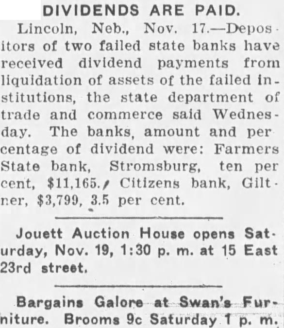 DIVIDENDS ARE PAID. Lincoln, Neb., Nov. itors of two failed state banks have received dividend payments from liquidation of assets failed institutions, the state department of trade and commerce Wednes day. The banks, amount and per centage of dividend were: Farmers State bank, Stromsburg, per cent, Citizens bank, Gilt ner, per cent. Jouett Auction House opens Sat urday, Nov. 19, at East 23rd street. Bargains Galore Swan's Furniture. Brooms 9c Saturday