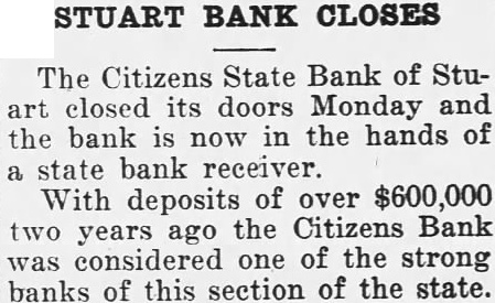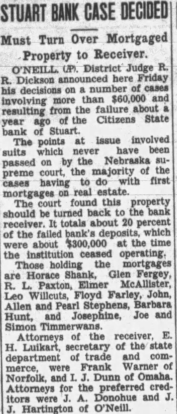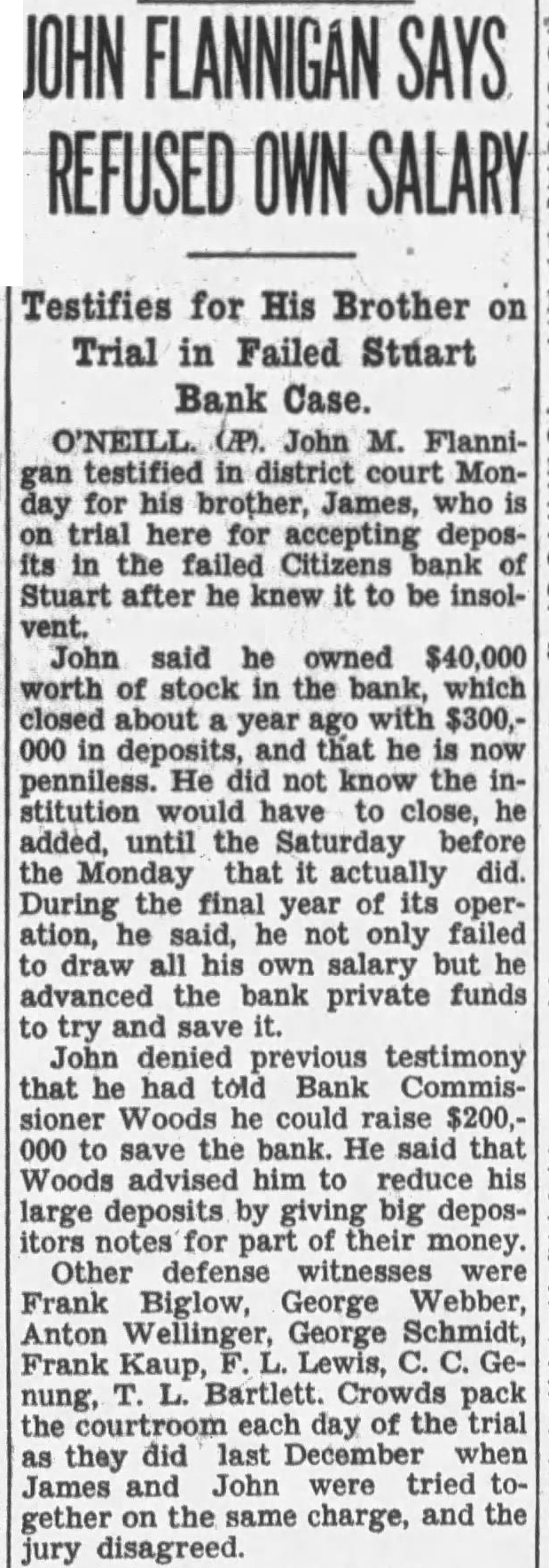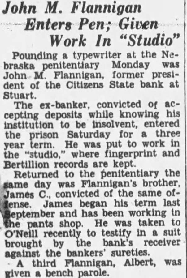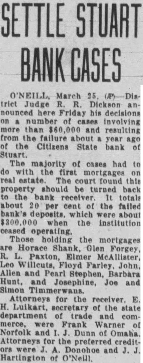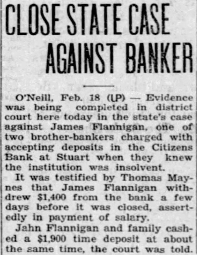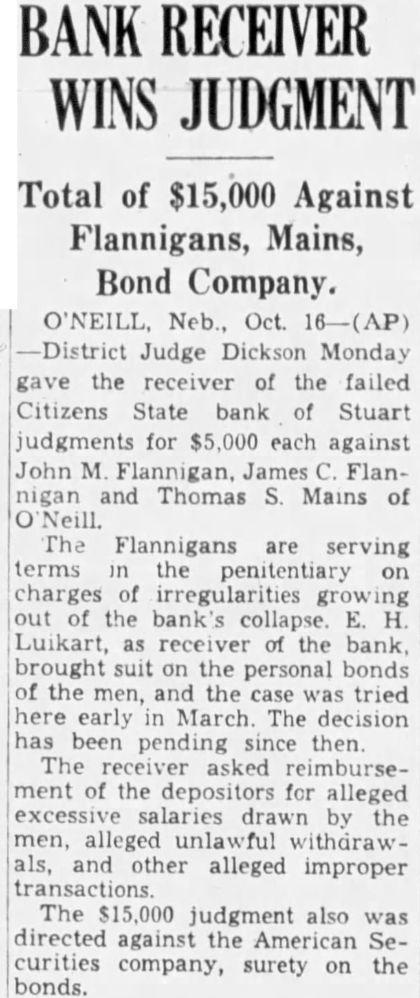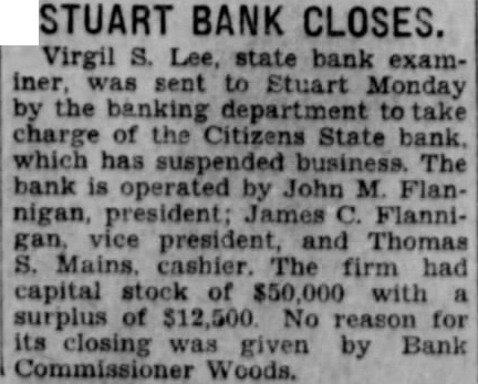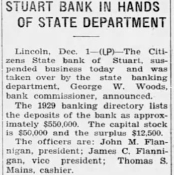Stuart Bank Fails Suspension of the Citizens State bank at Stuart, of which John M. Flannigan, prominent Nebraska banker, is president, was announced Monday at Lincoln by George F. Woods, state bank commissioner. Virgil S. Lee, state bank examiner, was placed in charge of the bank. The bank had a capital of $50,000 a surplus of $12,000 and deposits of approximately $600,000, according to the last financial statement of the bank. Mr. Flannigan is vice president and Thomas S. Mains, cashier.