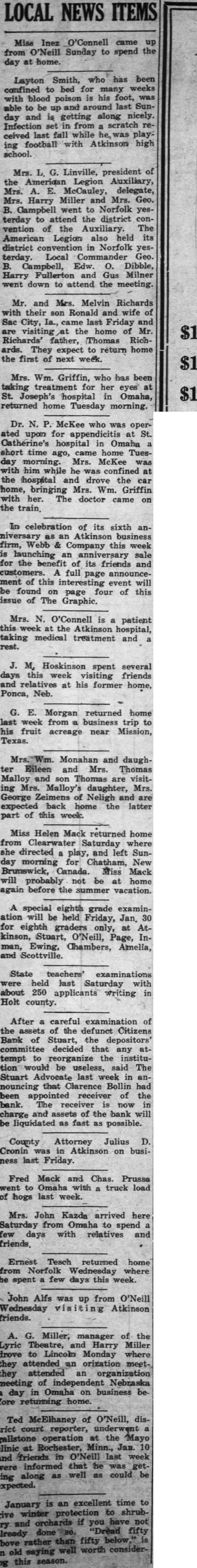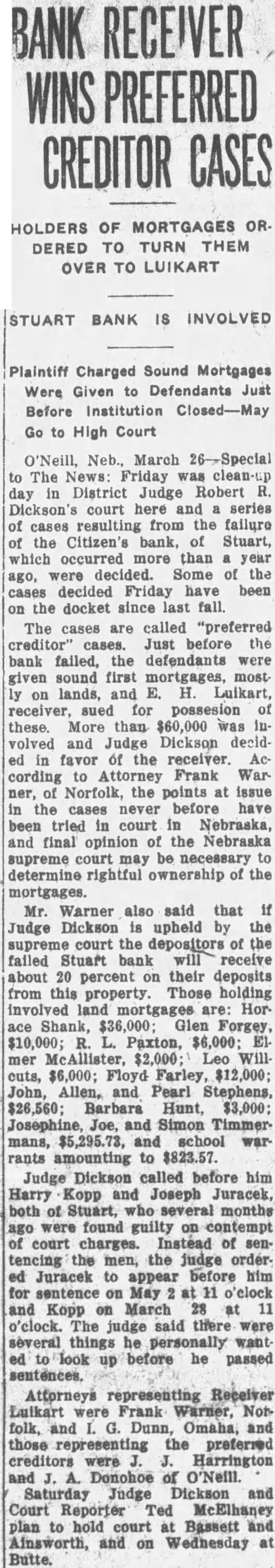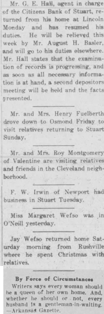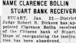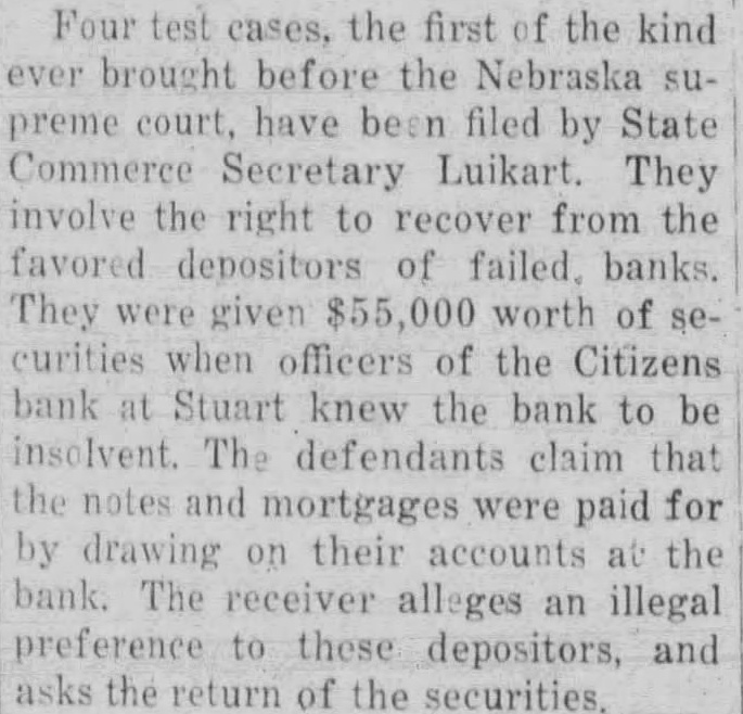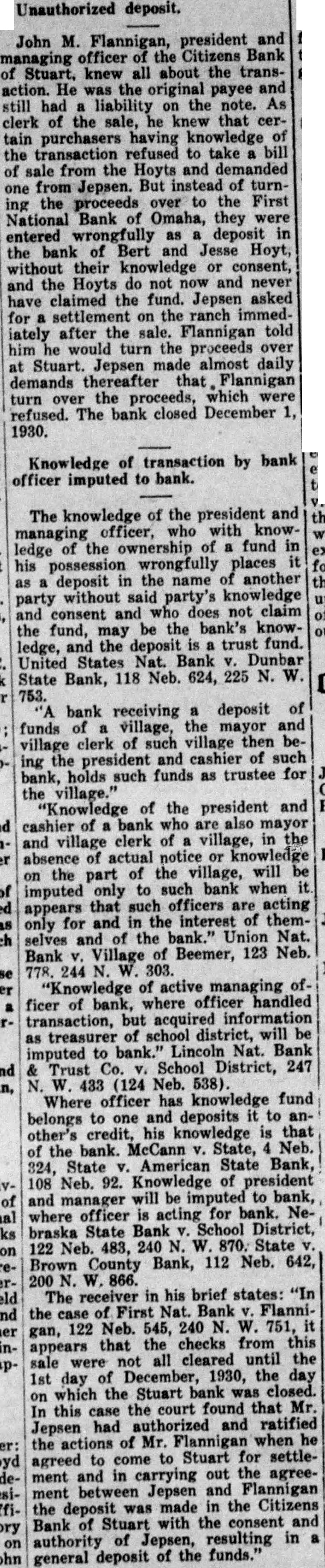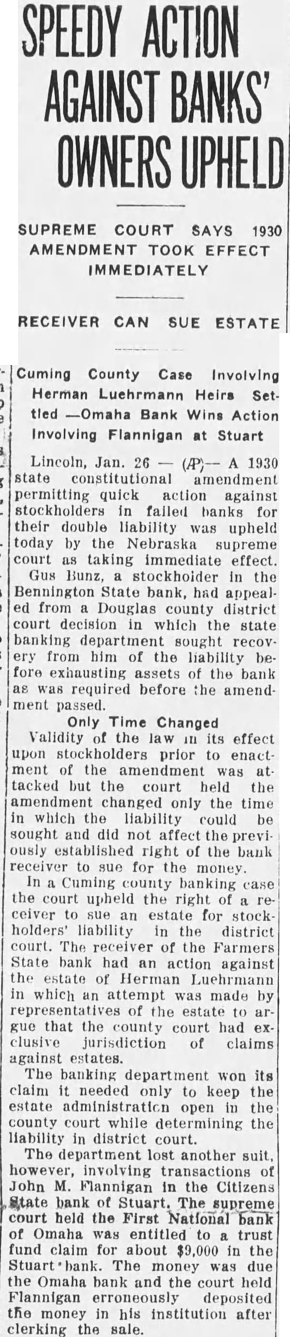 Stuart Bank Fails Suspension of the Citizens State bank at Stuart, of which John M. Flannigan, prominent Nebraska banker, is president, was announced Monday at Lincoln by George F. Woods, state bank commissioner. Virgil S. Lee, state bank examiner, was placed in charge of the bank. The bank had a capital of $50,000 a surplus of $12,000 and deposits of approximately $600,000, according to the last financial statement of the bank. Mr. Flannigan is vice president and Thomas S. Mains, cashier.