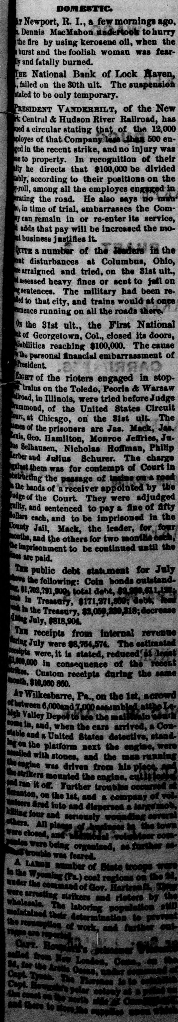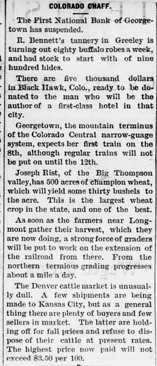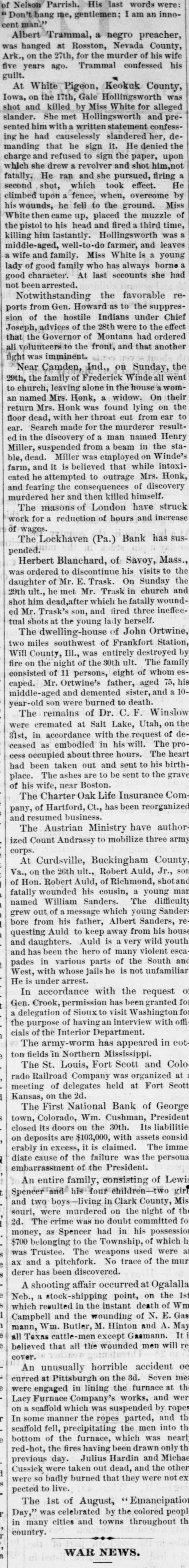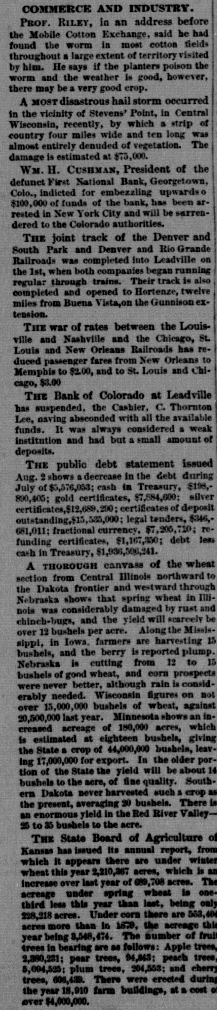 COMMERCE AND INDUSTRY. PROF. RILEY, in an address before the Mobile Cotton Exchange, said he had found the worm in most cotton fields throughout a large extent of territory visited by him. He says if the planters poison the worm and the weather is good, however, there may be a very good erop. A MOST disastrous hail storm occurred in the vicinity of Stevens' Point, in Central Wisconsin, recently, by which a strip of country four miles wide and ten long was almost entirely denuded of vegetation. The damage is estimated at $75,000. WM. H. CUSHMAN, President of the defunct First National Bank, Georgetown, Colo., indicted for embezzling upwards o $100,000 of funds of the bank, has been arrested in New York City and will be surrendered to the Colorado authorities. THE joint track of the Denver and South Park and Denver and Rio Grande Railroads was completed into Leadville on the 1st, when both companies began running regular through trains. Their track is also completed and opened to Hortenze, twelve miles from Buena Vista,on the Gunnison extension. THE war of rates between the Louisville and Nashville and the Chicago, St. Louis and New Orleans Railroads has reduced passenger fares from New Orleans to Memphis to $2.00, and to St. Louis and Chicago, $3.00 THE Bank of Colorado at Leadville has suspended, the Cashier, C. Thornton Lee, naving absconded with all the available funds. It was always considered a weak institution and had but a small amount of deposits. THE public debt statement issued Aug. 2 shows a decrease in the debt during July of $5,576,053; cash in Treasury, $198,890,405; gold certificates, $7,884,600; silver certificates,$12,689,290; certificates of deposit outstanding,$15,535,000; legal tenders, $346,681,011; fractional currency, $7,205,710; refunding certificates, $1,167,350; debt less cash in Treasury, $1,936,506,241. A THOROUGH canvass of the wheat section from Central Illinois northward to the Dakota frontier and westward through Nebraska shows that spring wheat in Illinois was considerably damaged by rust and chinch-bugs, and the yield will scarcely be over 12 bushels per acre. Along the Mississippi, in Iowa, farmers are harvesting 15 bushels, and the berry is reported plump. Nebraska is cutting from 12 to 15 bushels of good wheat, and corn prospects were never better, although rain is considerably needed. Wisconsin figures on not over 15,000,000 bushels of wheat, against 20,500,000 last year. Minnesota shows an increased acreage of 180,000 acres, which is estimated at eighteen bushels, giving the State a crop of 44,000,000 bushels, leaving 17,000,000 for export. In the older portion of the State the yield will be about 14 bushels to the acre, of fine quality. Southern Dakota never harvested such a erop as the present, averaging 20 bushels. There is an enormous yield in the Red River Valley25 to 35 bushels to the acre. THE State Board of Agriculture of Kansas has issued its annual report, from which it appears there are under winter wheat this year 2,210,267 acres, which is an increase over last year of 689,708 acres. The acreage under spring wheat is onethird less this year than last, being only 228,218 acres. Under corn there are 553,404 acres more than in 15.0, the acreage this year being 3,548,474. The number of fruit trees in bearing are as follows: Apple trees, 2,380,231; pear trees, 94,843; peach trees, 5,094,525; plum trees, 204,553; and cherry trees, 606,439. There were erected during the year 18,910 farm buildings, at a cost of over $4,000,000.