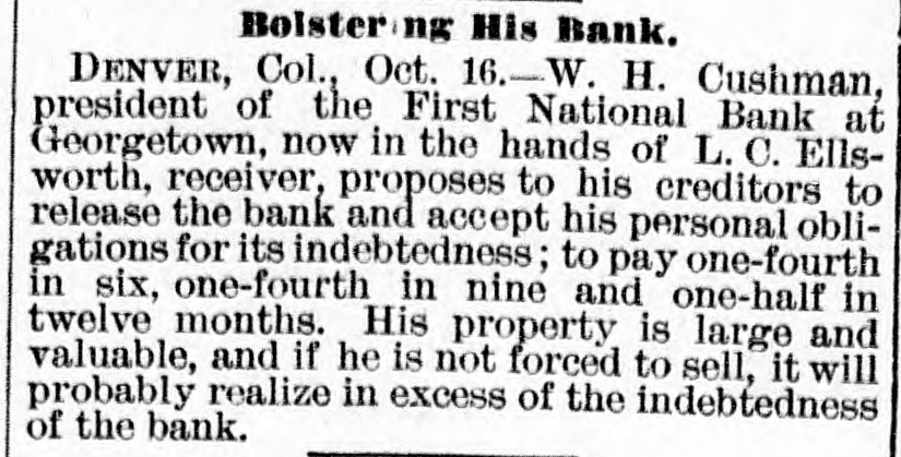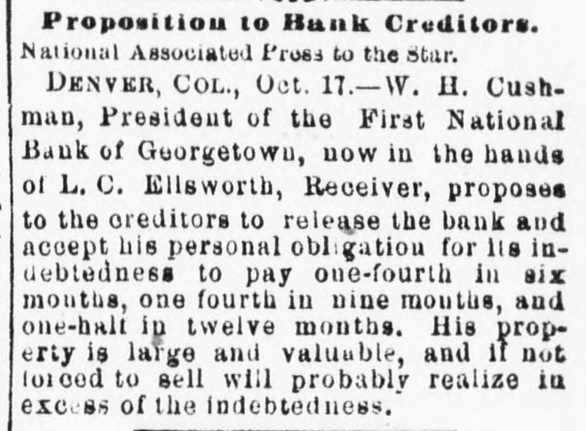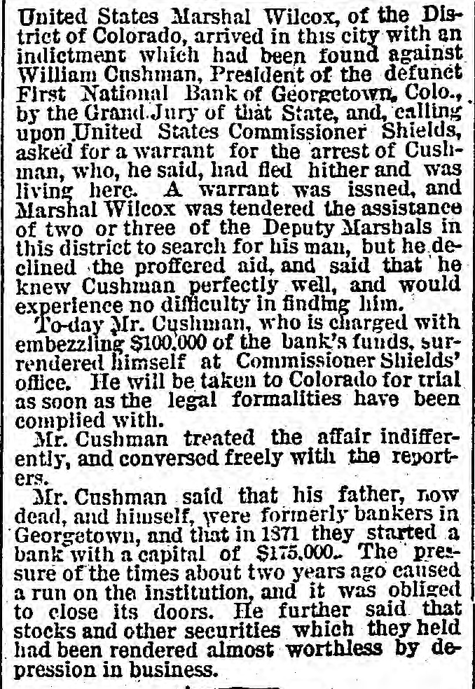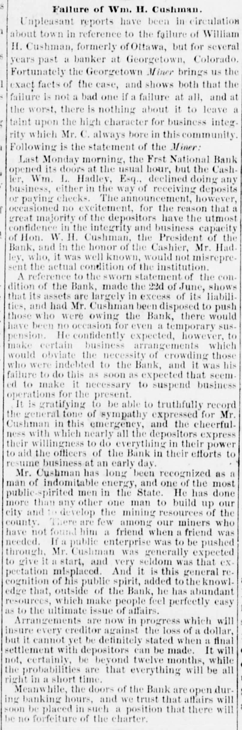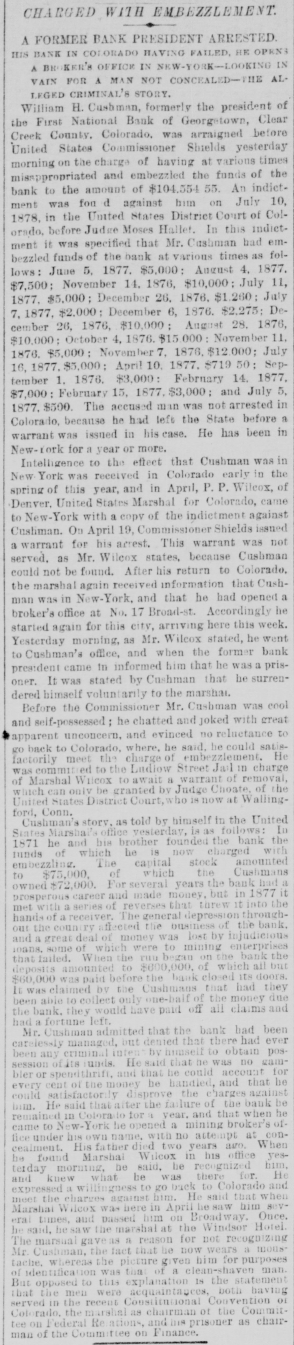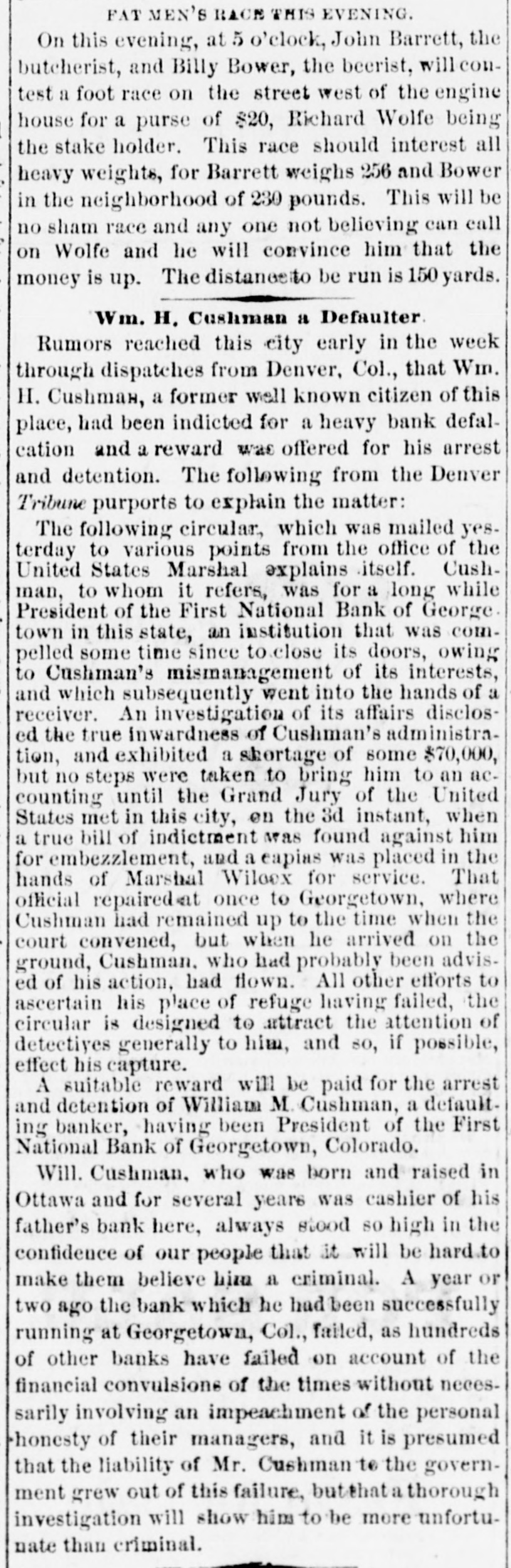COMMERCE AND INDUSTRY. PROF. RILEY, in an address before the Mobile Cotton Exchange, said he had found the worm in most cotton fields throughout a large extent of territory visited by him. He says if the planters poison the worm and the weather is good, however, there may be a very good erop. A MOST disastrous hail storm occurred in the vicinity of Stevens' Point, in Central Wisconsin, recently, by which a strip of country four miles wide and ten long was almost entirely denuded of vegetation. The damage is estimated at $75,000. WM. H. CUSHMAN, President of the defunct First National Bank, Georgetown, Colo., indicted for embezzling upwards o $100,000 of funds of the bank, has been arrested in New York City and will be surrendered to the Colorado authorities. THE joint track of the Denver and South Park and Denver and Rio Grande Railroads was completed into Leadville on the 1st, when both companies began running regular through trains. Their track is also completed and opened to Hortenze, twelve miles from Buena Vista,on the Gunnison extension. THE war of rates between the Louisville and Nashville and the Chicago, St. Louis and New Orleans Railroads has reduced passenger fares from New Orleans to Memphis to $2.00, and to St. Louis and Chicago, $3.00 THE Bank of Colorado at Leadville has suspended, the Cashier, C. Thornton Lee, naving absconded with all the available funds. It was always considered a weak institution and had but a small amount of deposits. THE public debt statement issued Aug. 2 shows a decrease in the debt during July of $5,576,053; cash in Treasury, $198,890,405; gold certificates, $7,884,600; silver certificates,$12,689,290; certificates of deposit outstanding,$15,535,000; legal tenders, $346,681,011; fractional currency, $7,205,710; refunding certificates, $1,167,350; debt less cash in Treasury, $1,936,506,241. A THOROUGH canvass of the wheat section from Central Illinois northward to the Dakota frontier and westward through Nebraska shows that spring wheat in Illinois was considerably damaged by rust and chinch-bugs, and the yield will scarcely be over 12 bushels per acre. Along the Mississippi, in Iowa, farmers are harvesting 15 bushels, and the berry is reported plump. Nebraska is cutting from 12 to 15 bushels of good wheat, and corn prospects were never better, although rain is considerably needed. Wisconsin figures on not over 15,000,000 bushels of wheat, against 20,500,000 last year. Minnesota shows an increased acreage of 180,000 acres, which is estimated at eighteen bushels, giving the State a crop of 44,000,000 bushels, leaving 17,000,000 for export. In the older portion of the State the yield will be about 14 bushels to the acre, of fine quality. Southern Dakota never harvested such a erop as the present, averaging 20 bushels. There is an enormous yield in the Red River Valley25 to 35 bushels to the acre. THE State Board of Agriculture of Kansas has issued its annual report, from which it appears there are under winter wheat this year 2,210,267 acres, which is an increase over last year of 689,708 acres. The acreage under spring wheat is onethird less this year than last, being only 228,218 acres. Under corn there are 553,404 acres more than in 15.0, the acreage this year being 3,548,474. The number of fruit trees in bearing are as follows: Apple trees, 2,380,231; pear trees, 94,843; peach trees, 5,094,525; plum trees, 204,553; and cherry trees, 606,439. There were erected during the year 18,910 farm buildings, at a cost of over $4,000,000.