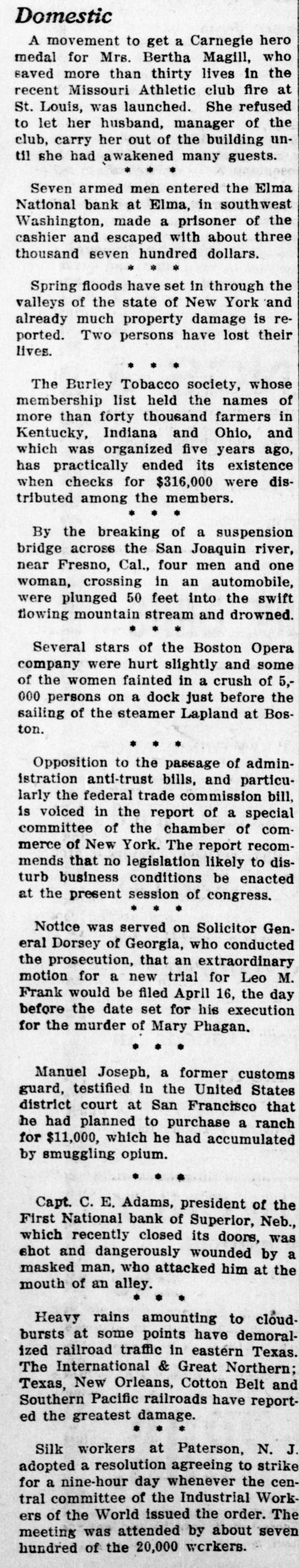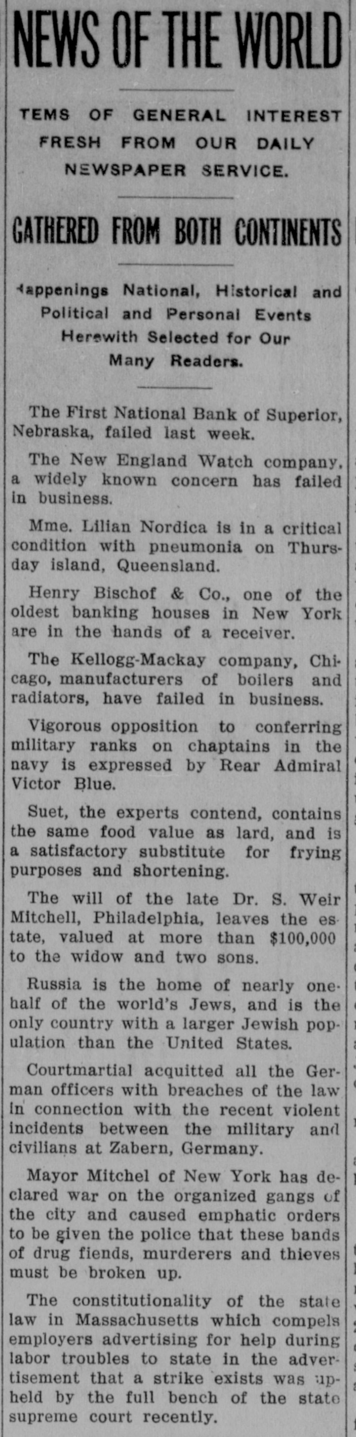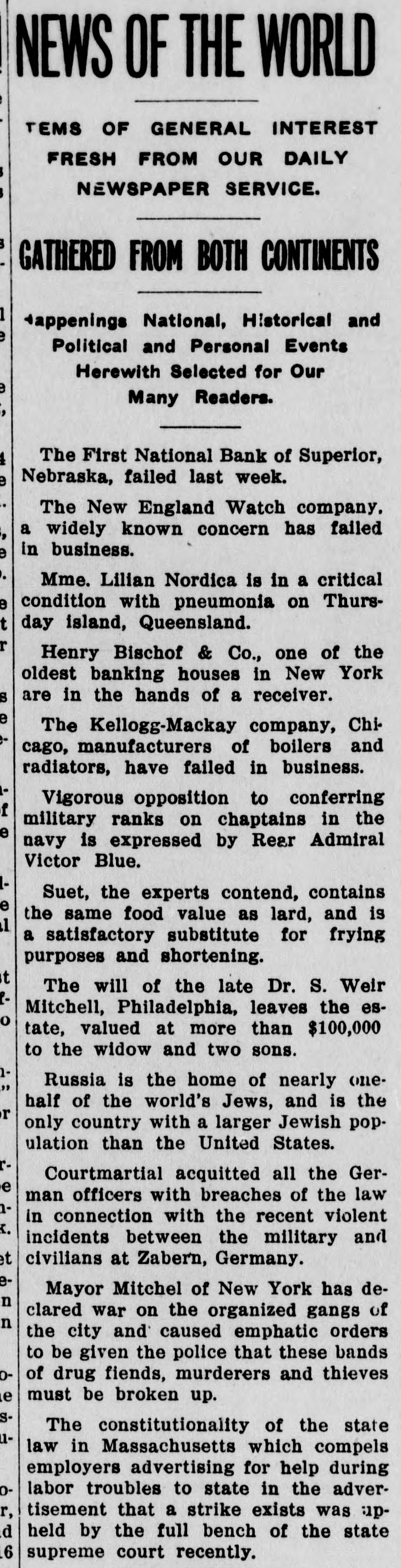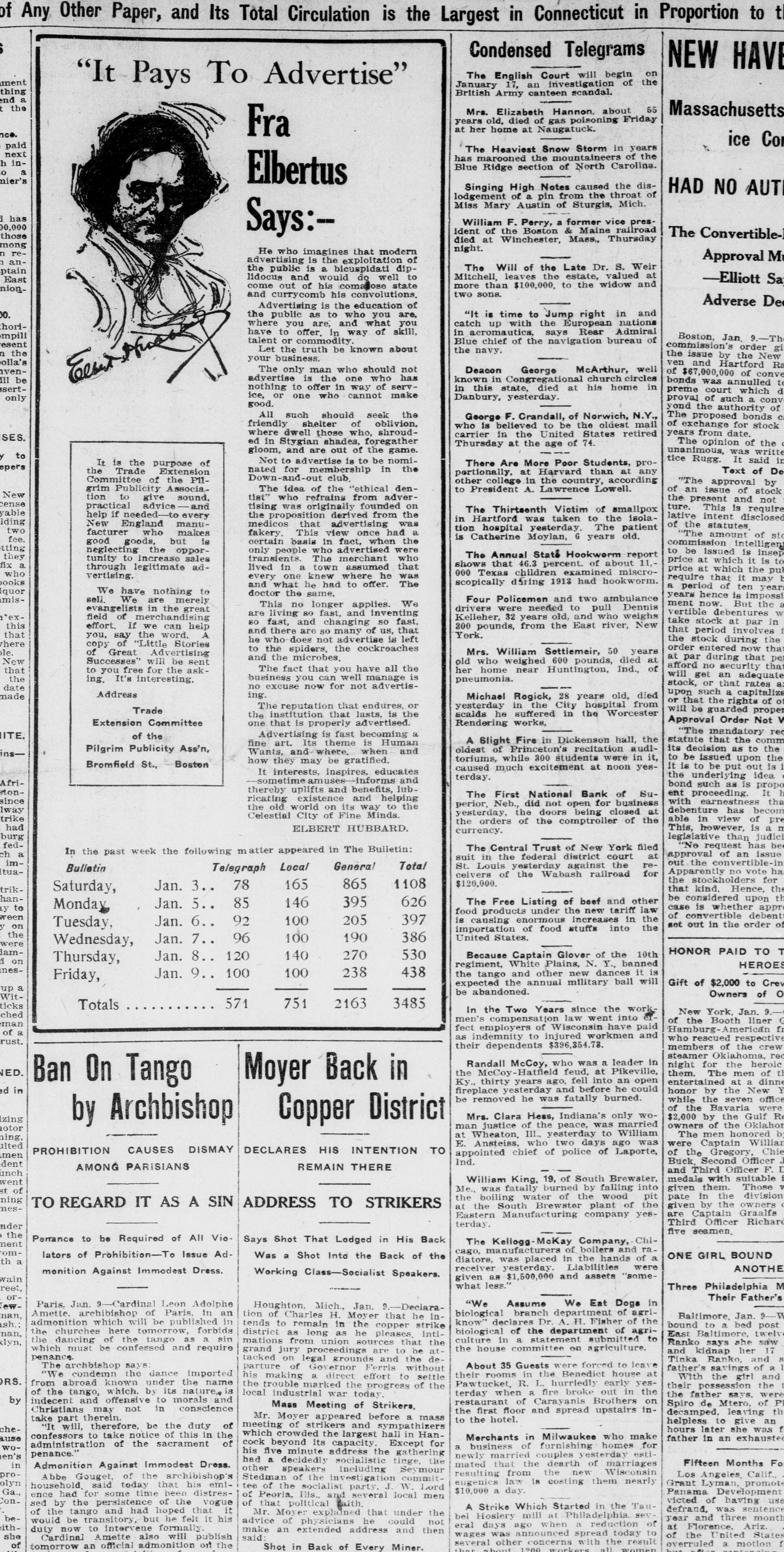 of t Any Other Paper, and Its Total Circulation is the Largest in Connecticut in Proportion to $ Condensed Telegrams NEW HAVE The English Court will begin on ment January 17. an investigation of the " It Pays To Advertise" thing British Army canteen scandal. end a the Mrs. Elizabeth Hannon. about 55 Massachusetts years old, died of gas poisoning Friday at her home at Naugatuck. Fra nce. ice Co paid The Heaviest Snow Storm in years next has marooned the mountaineers of the h inBlue Ridge section of North Carolina. o a nier's Elbertus Singing High Notes caused the disHAD NO AUT lodgement of a pin from the throat of Miss Mary Austin of Sturgis, Mich has William F. Perry, a former vice pres00,000 ident of the Boston & Maine railroad Says:The Convertiblethose died at Winchester, Mass., Thursday mong night. He who imagines that modern n reApproval M advertising is the exploitation of h anThe Will of the Late Dr. S. Weir the public is a bicuspidati dipptain Mitchell, leaves the estate, valued at lidocus and would do well to East -Elliott Sa more than $100,000, to the widow and come out of his comanose state niontwo sons. and currycomb his convolutions Adverse De Advertising is the education of the public as to who you are, "It is time to Jump right in and 00. where you are. and what you catch up with the European nations thoriin aeromautics, says Rear Admiral have to offer in way of skill, mpili Boston, Jan 9.-The talent or commodity Blue chief of the navigation bureau of esent commission's order gi Let the truth be known about the navy. n the the issue by the New your business. olla's ven and Hartford Ra The only man who should not venDeacon George McArthur, well of $67,000,000 of conve advertise is the one who has known in Congregational church circles ill be bonds was annulled nothing to offer in way of servin this state, died at his home in sertd preme court which ice, or one who cannot make Danbury, yesterday only proval of such a conv good. yond the authority of All such should seek the The proposed bonds c George F. Crandall, of Norwich, N.Y. friendly shelter of oblivion. of exchange for stock who is believed to be the oluest mail where dwell those who, shroudyears from date. carrier in the United States retired SES. ed in Stygian shades. foregather The opinion of the Thursday at the age of 74. gloom, and are out of the game. unanimous, was writte to y tice Rugg. It said Not to advertise 18 to be nomiThere Are More Poor Students, proIt is the purpose of epers nated for membership in the Text of De the Trade Extension portionally, at Harvard than at any Down-and-out club Committee of the P11other college in the country, according "The approval by The idea of the "ethical dento President A. Lawrence Lowell. grim Publicity Associaof an issue of stock New tist" who refrains from advertion to give sound, the present and not cense practical advice and tising was originally founded on ture. This is require The Thirteenth Victim of smallpox yable the proposition derived from the help if needed- every lative intent disclosed in Hartford was taken to the isolaIding New England manumedicos that advertising was of the statutes tion hospital yesterday The patient two facturer who makes fakery This view once had a "The amount of st is Catherine Moylan, 6 years old. fee. certain basis in fact, when the good goods, but is commission intelligent tting only people who advertised were neglecting the opporto be issued is insep The Annual State Hookworm report they tunity to increase sales transients. The merchant who price at which it is to shows that 46.3 percent. of about 11,fix lived in a town assumed that through legitimate adprice at which the pub 000 Texas children examined miscrowho vertising. every one knew where he was require that it may ooks scopically d5ring 1913 had hookworm. and what he had to offer. The a period of ten year iquor We have nothing to doctor the same. years hence is impossi Four Policemen and two ambulance missell We are merely ment now. But the This no longer applies. We drivers were needed to pull Dennis evangelists in the great vertible debentures are living so fast, and inventing *exfield of merchandising Kelleher, 32 years old, and who weighs take stock at par in so fast, and changing so fast, this 300 pounds, from the East river, New effort. If we can help that period involves and there are so many of us, that that York. you, say the word. A he who does not advertise is left the stock during the where copy of "Little Stories order entered now tha to the spiders, the cockreaches Mrs. William Settlemeir, 50 years le. of Great Advertising and the microbes, at par during that per New old who weighed 600 pounds, died at Successes" will be sent afford no security that The fact that you have all the to you free for the askthat her home near Huntington, Ind., of will get an adequate business you can well manage is the pneumonia. ing. It's interesting stock, or that rates no excuse now for not advertisdate upon such a capitalize Address ing. made Michael Rogick, 28 years old, died or that the rights of of yesterday in the City hospital from The reputation that endures, or Trade will be guarded proper scalds he suffered in the Worcester the institution that lasts, is the Approval Order Not V Extension Committee Rendering works, one that is properly advertised. "The mandatory red ITE. Advertising is fast becoming a of the statute that the comm A Slight Fire in Dickenson hall, the fine art. Its theme is Human its decision as to the oldest of Princeton's recitation audiPilgrim Publicity Ass'n, Wants, and where. when and to be issued upon the toriums. while 300 students were in it, how they may be gratified. Bromfield St., Boston it is to be put out is caused much excitement at noon yesIt interests, inspires, educates the underlying idea terday. -sometimeamus -informs and Afribond such as is propo thereby uplifts and benefits, lub. stonent proceeding. It The First National Bank of Suric