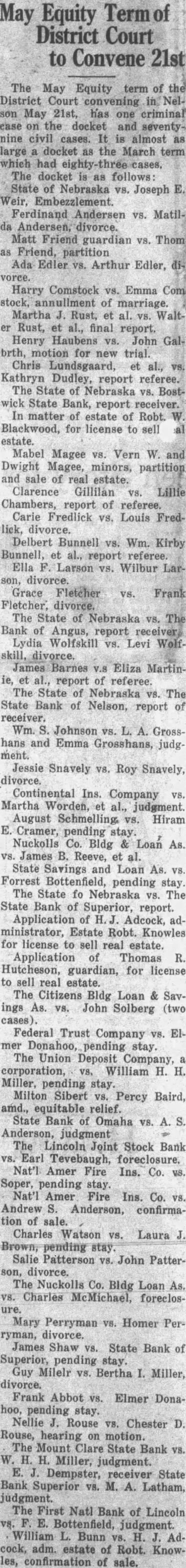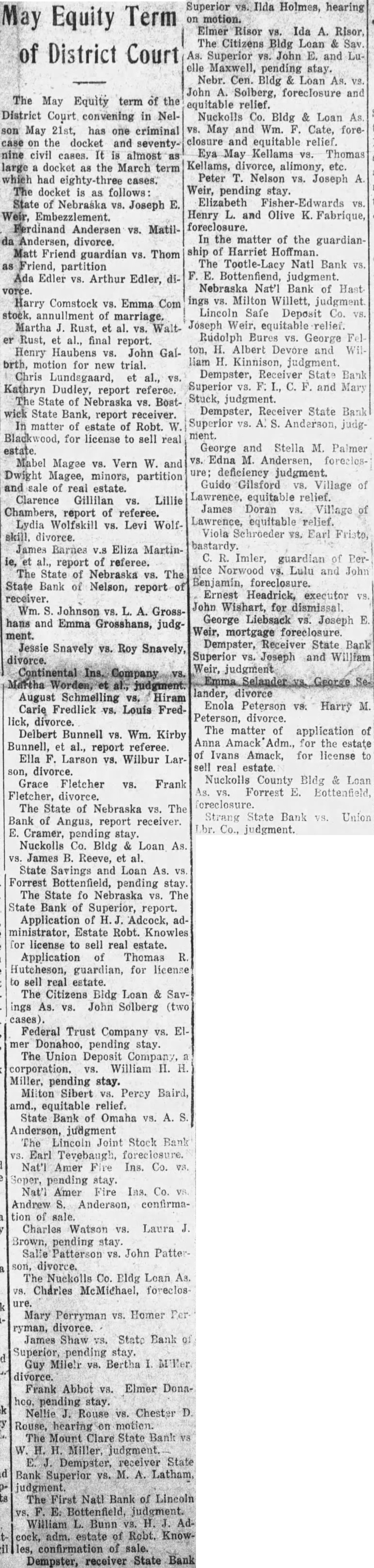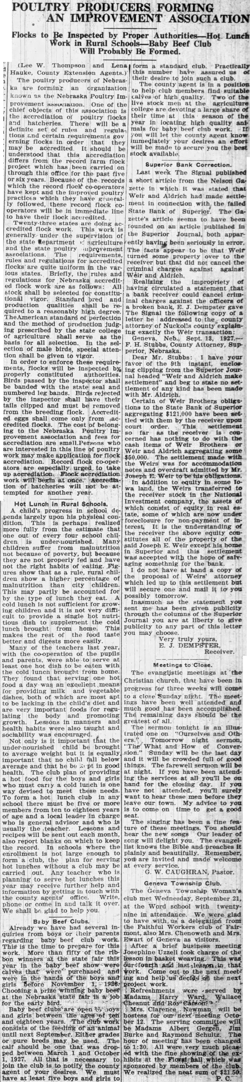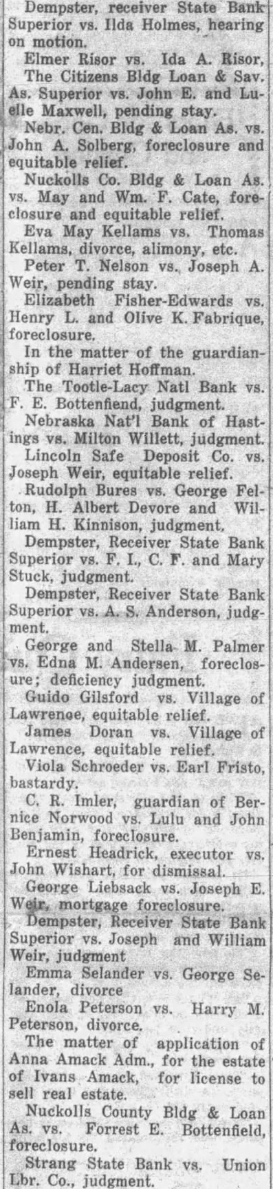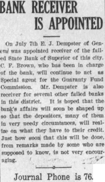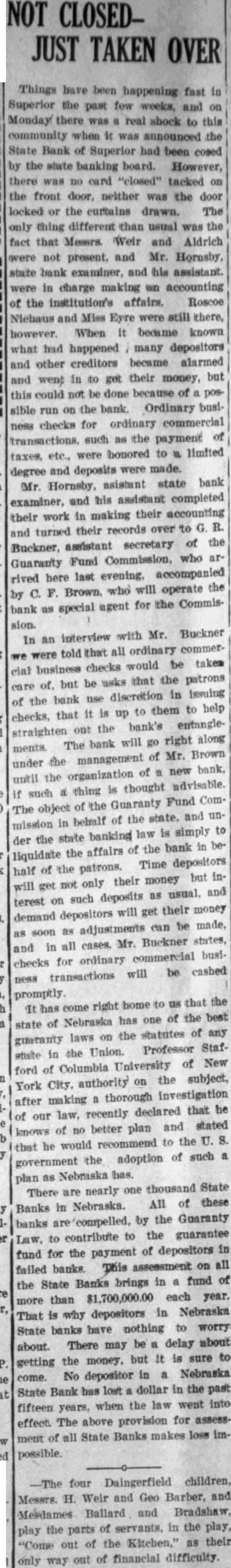 NOT CLOSEDJUST TAKEN OVER Things have been happening fast in Superior the past few weeks, and on Monday there was a real shock to this community when it was announced the State Bank of Superior had been cosed by the state banking board. However, there was no card "closed" tacked on the front door, neither was the door locked or the curtains drawn. The only thing different than usual was the fact that Messrs. Weir and Aldrich were not present, and Mr. Hornsby, state bank examiner, and his assistant. were in charge making an accounting of the institution's affairs. Roscoe Mehaus and Miss Eyre were still there, however. Wihen it became known what had happened many depositors and other creditors became alarmed and went in to get their money, but this could not be done because of a possible run on the bank. Ordinary business checks for ordinary commercial transactions, such as the payment of taxes, etc., were honored to a limited degree and deposits were made. Mr. Hornsby, asistant state bank examiner, and his assistant completed their work in making their accounting and turned their records over to G. R. Buckner, assistant secretary of the Guaranty Fund Commission, who arrived here last eventng, accompanied by C. F. Brown. who will operate the bank as special agent for the Commission. In an interview with Mr. Buckner we were told that all ordinary commercial business checks would be taken care of. but be asks that the patrons of the bank use discretion in issuing checks, that It is up to them to help straighten out the bank's entanglements. The bank will go right along under the management of Mr. Brown until the organization of a new bank, if such a thing is thought advisable. The object of the Guaranty Fund Commission in behalf of the state. and under the state banking law is simply to liquidate the affairs of the bank in be half of the patrons. Time depositors will get not only their money but interest on such deposits as usual, and demand depositors will get their money as soon as adjustments can be made, and in all cases. Mr. Buckner states, checks for ordinary commercial business transactions will be cashed promptly. It has come right home to us that the state of Nebraska has one of the best guaranty laws on the statutes of any state in the Union. Professor Stafford of Columbia University of New York City, authority on the subject, after making a thorough investigation of our law, recently declared that he knows of no better plan and stated that he would recommend to the U. S. government the adoption of such a plan as Nebraska has. There are nearly one thousand State Banks in Nebraska. All of these banks are compelled, by the Guaranty Law. to contribute to the guarantee fund for the payment of depositors in failed banks. This assessment on all the State Banks brings in a fund of more than $1,700,000.00 each year That is why depositors in Nebraska State banks have nothing to worry about. There may be a delay about getting the money. but It is sure to come. No depositor in a Nebraska State Bank has lost a dollar in the past fifteen years, when the law went into effect. The above provision for assessment of all State Banks makes loss impossible. -The four Daingerfield children, Messrs. H. Weir and Geo Barber, and Mesdames Ballard and Bradshaw, play the parts of servants, in the play, "Come out of the Kitchen," as their only way out of financial difficulty.