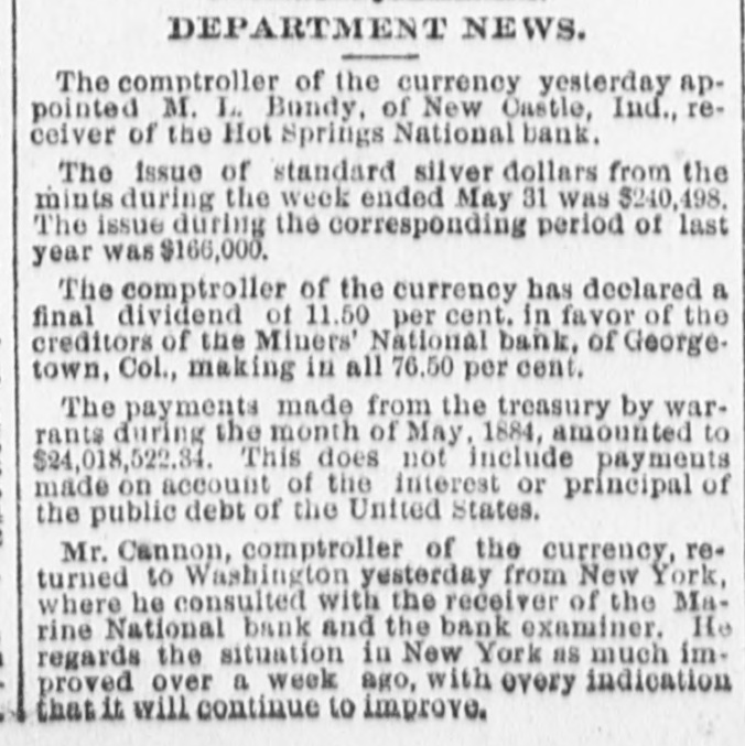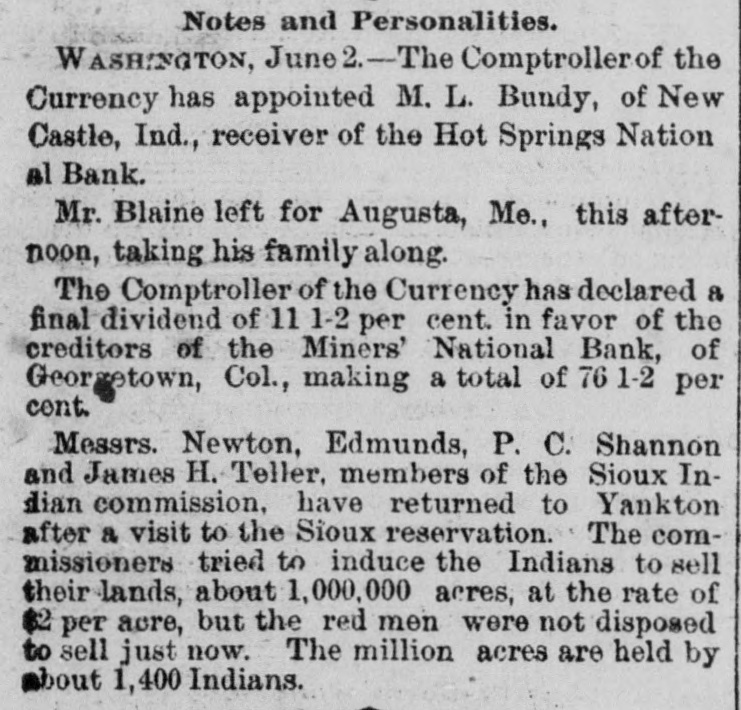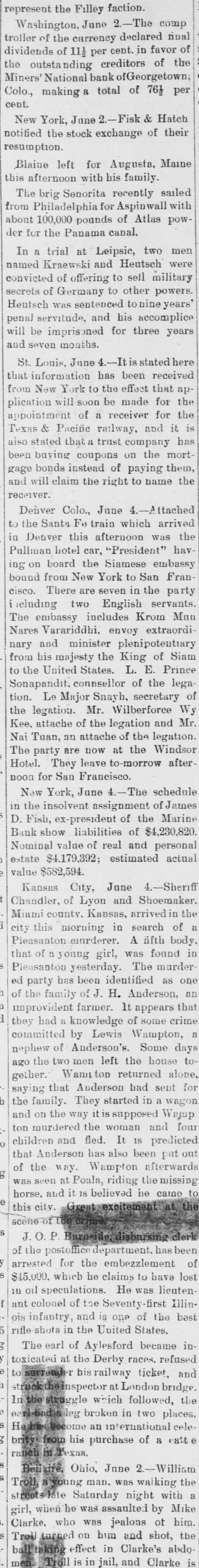 represent the Filley June 2.-The comp of the troller Washington, currency declared in favor rinal dividends of 111 per cent. of the the outstanding creditors of Miners' National bank of Georgetown; Colo., making 8 total of 761 per cent. New York, June .-Fisk & Hatch notified the stock exchange of their resumption. Blaine left for Augusta, Maine this afternoon with his family. The brig Senorita recently sailed from Philadelphia for Aspinwall with about 100,000 pounds of Atlas powder for the Panama canal, In a trial at Leipsic, two men named Kraewski and Heutsch were convicted of offering to sell military secrets of Germany to other powers. Heutsch was sentenced to nine years' penal servitude, and his accomplice will be imprisoned for three years and seven months. St. Louis, June 4.-It is stated here that information has been received from New York to the effect that application will soon be made for the appointment of a receiver for the Texas & Pacine railway, and it is also stated that a trust company has been buying coupons on the mortgage bonds instead of paying them, the and will claim the right to name receiver. Deúver Colo., June -Attached to the Santa Fe train which arrived in Deover this afternoon was the Pullman hotel car, "President" having on board the Siamese embassy bound from New York to San Francisco. There are seven in the party including two English servants. The embassy includes Krom Mun Nares Varariddhi, envoy extraordinary and minister plenipotentuary from bis majesty the King of Siam to the United States. L. E. Prince Sonapandit. connsellor of the legation. Le Major Snayh, secretary of the legation. Mr. Wilberforce Mr. Wy Kee. attache of the legation and Nai Tuan, an attache of the legation. The party are now at the Windsor Hotel. They leave to-morrow afternoon for San Francisco. New York, June 4. The schedule in the insolvent assignment of James D. Fish, ex-president of the Marine Bank show liabilities of $4,230,820. Nominal value of real and personal estate $4.179,392; estimated actual value $582,594. Kansas City, June 4.-Sheriff t Chandler, of Lyon and Shoemaker. the Miami county. Kausas, arrived in city this morning in search of Pleasanton murderer. A fifth body. in that of young girl, was found Pleasanton yesterday. The murder ed party has been identified as one an of the family of J. H. Anderson, improvident farmer. It appears that they had a knowledge of some crime committed by Lewis Wampton, nephew of Anderson's. Some days tothe two men left the house gether. ago Wann ton returned alone, for saying that Anderson had sent the family. They started in a wagon and on the way it is supposed Wamp murdered the woman and four children ton and fled. It is predicted out that Anderson has also been put go of the way. Wampton afterwards was seen at Poala, riding the missing to horse. and it 18 believed he came the this city. Great exoitement at scene of tue crimps S J.O.P. of the postoffice department. of arrested for the embezzlement $15,000, which he claims to have lost oil speculations. He was lieuten- Illin10 ant colonel of the Seventy-first best ois infantry, and is one of the rifle-shots in the United States. inThe earl of Aylesford became toxicated at the Derby races. refused and to sorrender his railway ticket, tuok theinspector at London bridge the In the struggle which followed, earlobadia.leg broken in two places, celean international britys from his purchase of a catt ranch in Texas, Bettuire, Ohio, June 2.--William Troll, a young man. was waiking the centsrate Saturday night with a wilen he was assaulted by Mike him. girl, Clarke, who was jealous of the Troll turned on him and shot, abdoball laking effect in Clarke's me Troll is in jail, and Clarke is