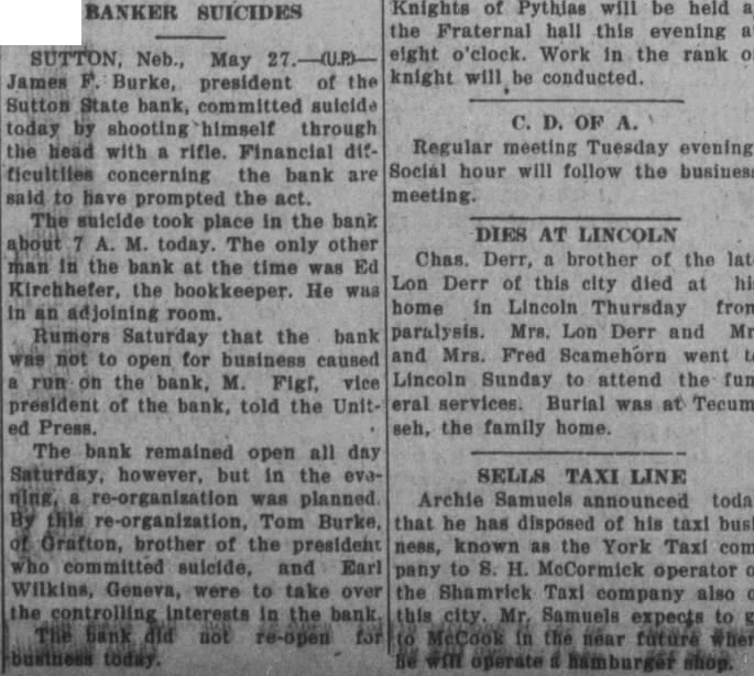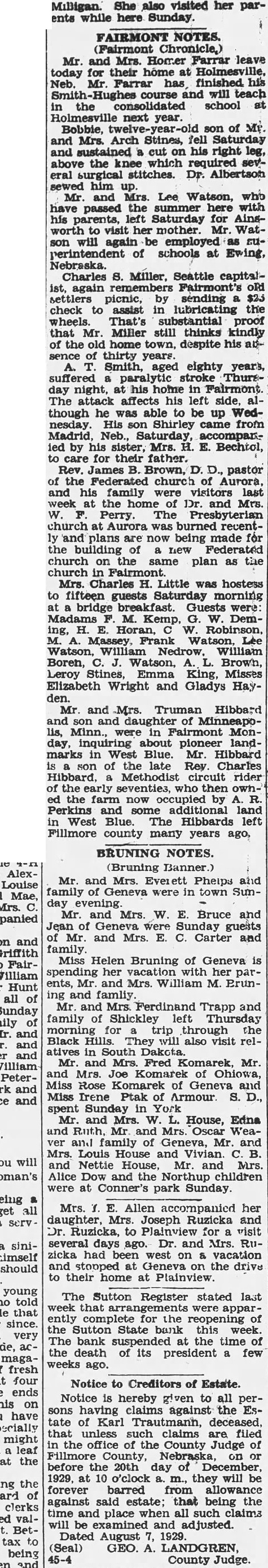 FAIRMONT NOTES. (Fairmont Chronicle,) Mr. and Mrs. Homer Farrar leave today for their home at Neb. Farrar has finished his course and will teach the consolidated school next year. Bobbie, son of Mr. and Mrs. Arch Stines, fell Saturday and sustained cut on his right above the knee which required eral surgical stitches. Dr. Albertson sewed him up. Mr. and Mrs. Lee Watson, who have passed the summer here with his parents, left Saturday Ainsworth to visit her mother. Watson will again be employed perintendent of schools at Nebraska. Charles Miller, Seattle capitalagain Fairmont's old settlers picnic, by sending $23 check to assist in lubricating the wheels That's substantial proof that Mr. Miller still thinks kindly of the old home town, despite his sence of thirty years. Smith, aged eighty years, suffered paralytic stroke Thursday night, his home in Fairmont. The attack affects his left side, though he was able to be up Wednesday. His son Shirley came from Madrid, Neb., Saturday, accompanied by his sister, Mrs. H. Bechtol, to care for their father. Rev. James Brown, pastor of the Federated church of Aurora, and his family were visitors last week at the home Dr. and Mrs. Perry. The Presbyterian church Aurora was burned recentand plans are now being made for the building of new Federated church on the same plan as the church Mrs. Charles H. Little was hostess to fifteen guests Saturday morning bridge Guests M. Kemp. W. DemLee Watson, Nedrow, William Boren, Watson, Brown, Leroy Stines, Emma King. Misses Elizabeth Wright and Gladys Hayden. Mr. and Mrs Truman Hibbard and son and daughter of Minneapolis, Minn., were Fairmont Monday, inquiring about pioneer landmarks in West Blue. Mr. Hibbard son of the late Rev. Charles Hibbard. Methodist circuit rider of the seventies, who then the farm now occupied by Perkins some additional land West Blue. The Hibbards left Fillmore county many years ago,