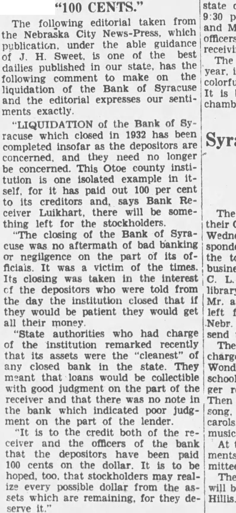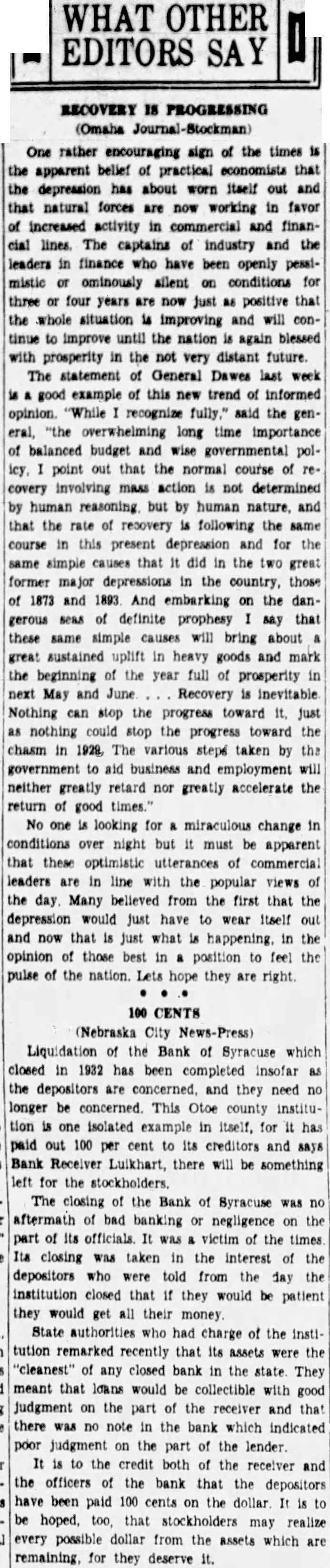 WHAT OTHER EDITORS SAY RECOVERY IS PROGRESSING (Omaha One rather encouraging sign of the times the apparent belief of practical economists that the depression has about worn itself out and that natural forces are now working in favor of increased activity in commercial and financial lines. The captains of industry and the leaders in finance who have been openly pessimistic or ominously on conditions for three or four years are as positive that the whole situation improving and will continue improve until the nation again blessed with prosperity in the not very distant future. The statement of General Dawes last week good example of this new trend of informed opinion. "While recognize fully. said the gen eral, "the overwhelming long time importance of balanced budget and wise governmental policy point out that the normal course of covery involving mass action is not determined by human reasoning but by human nature, and that the rate of following the same course in this present depression and for the same simple causes that did in the two great former depressions in the country, those of 1873 and 1893 And embarking on the dangerous seas of definite prophesy say that these simple causes will bring about great sustained uplift in heavy goods and mark the beginning of the year full of prosperity in next May and June Recovery is inevitable Nothing can stop the progress toward it, just as nothing could stop the progress toward the chasm in 1929, The various steps taken by the government to aid business and employment will neither greatly retard nor greatly accelerate the return of good times." No one is looking for miraculous change in conditions over night but it must be apparent that these optimistic utterances of commercial leaders are in line with the popular views of the day Many believed from the first that the depression would just have to wear itself out and that is just what happening, in the opinion of those best in position to feel the pulse of the nation Lets hope they are right. 100 CENTS (Nebraska City Liquidation of the Bank of Syracuse which closed in 1932 has been completed insofar the depositors are concerned, and they need no longer be concerned. This Otoe county institution one isolated example in itself, for it has paid out 100 per cent to its creditors and says Bank Receiver Luikhart, there will be something left for the stockholders. The closing of the Bank of Syracuse was no aftermath of bad banking or negligence on the part of its officials was victim of the times Its closing was taken in the interest of the depositors who were told from the day the institution closed that if they would be patient they would get all their money State authorities who had charge of the institution remarked recently that its assets were the "cleanest" of any closed bank in the state They meant that loans would be collectible with good judgment on the part of the receiver and that there was no note in the bank which indicated poor judgment on the part of the lender. It is to the credit both of the receiver and the officers of the bank that the depositors have been paid 100 cents on the dollar. It to be hoped, too, that stockholders may realize every possible dollar from the assets which are remaining, for they deserve it.
