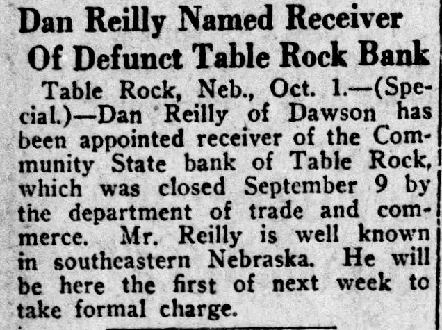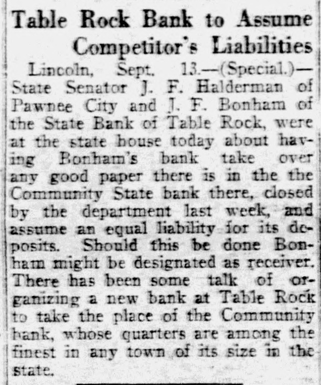 Table Rock Bank to Assume Competitor's Liabilities Lincoln, Sept. 13.-(Special.)State Senator J. F. Halderman of Pawnee City and J. F. Bonham of the State Bank of Table Rock, were at the state house today about having Bonham's bank take over any good paper there is in the the Community State bank there, closed by the department last week, and assume an equal liability for its deposits. Should this be done Bonham might be designated as receiver. There has been some talk of organizing a new bank at Table Rock to take the place of the Community bank, whose quarters are among the finest in any town of its size in the state.
