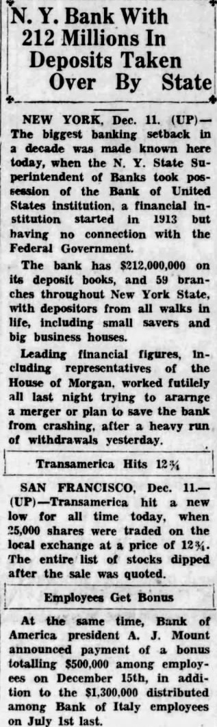 Newspaper articles describe heavy withdrawals (runs) at branches Dec. 11, 1930, followed by the New York State Superintendent of Banks taking possession (suspension) Dec. 11, 1930. The institution never resumed normal operations and was liquidated; directors and officers were later indicted. OCR errors in some articles were present but did not obscure core facts.