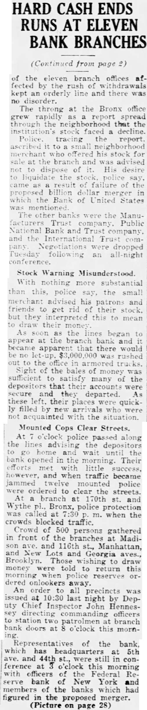 (Continued from page 2) of the eleven branch offices affected by the rush of withdrawals kept an orderly line and there was no disorder. The throng at the Bronx office grew rapidly as a report spread through the neighborhood that the institution's stock faced a decline. Police. tracing the report. ascribed it to a small neighborhood merchant who offered his stock for sale at the branch and was advised not to dispose of it. His desire to liquidate the stock, police say, came as a result of failure of the proposed billion dollar merger in which the Bank of United States was mentioned. The other banks were the Manufacturers Trust company, Public National Bank and Trust company, and the International Trust company. Negotiations were dropped Tuesday following an all-night conference.