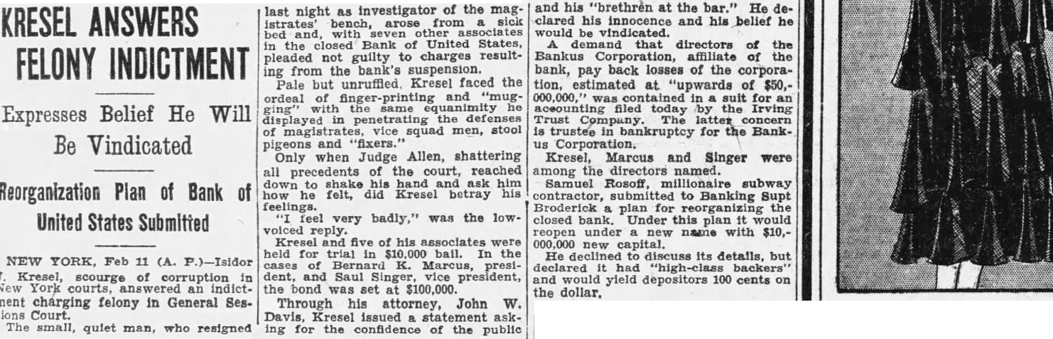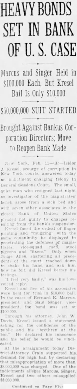 NEW YORK, Feb 11 (A. P.)-Isidor Kresel, scourge of corruption in New York answered an indictment charging felony in General Sessions Court. The small, quiet man, who resigned last night as investigator of the magistrates bench, arose from sick with seven other in the closed Bank of United States, pleaded not guilty to charges resulting from the bank's suspension. Pale but unruffled Kresel faced the ordeal of printing and "mugwith the same equanimity he displayed in penetrating the of magistra vice squad men, stool pigeons and Only when Judge Allen, shattering all precedents of the court, reached down to shake his hand and ask him how he felt, did Kresel betray feelings. feel very badly," was the lowvoiced reply. Kresel and five of his associates were held for trial in bail. In the cases of Bernard K. Marcus, president, and Saul vice president, the bond was set at $100,000. Through his attorney, John W. Davis, Kresel issued statement asking for the confidence of the public and his "brethren at the bar." He declared his innocence and his belief he would be vindicated. demand that directors of the Bankus affiliate the bank, pay back losses of the corporation, estimated at "upwards of $50,000,000, was in suit for an accounting filed today by the Irving Trust Company. The latter concern is trustee in bankruptcy for the Bankus Corporation. Kresel, Marcus and Singer were among the directors named. Samuel Rosoff, millionaire subway contractor, submitted to Banking Supt Broderick plan for the closed bank. Under this plan it would reopen under new name with $10,000,000 new capital. He declined to discuss its details, but declared had "high-class backers and would yield depositors 100 cents on the dollar.