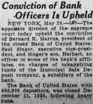 Conviction of Bank Officers Is Upheld NEW YORK, May appeliate division the supreme court today upheld the conviction of Bernard Marcus, president of the closed Bank of United States: Singer, executive dent, Singer's son, Herbert. officer in some the bank's affillates, charges funds the Safe Deposit company, subsidiary the bank. The Bank of United States. with closed 11,