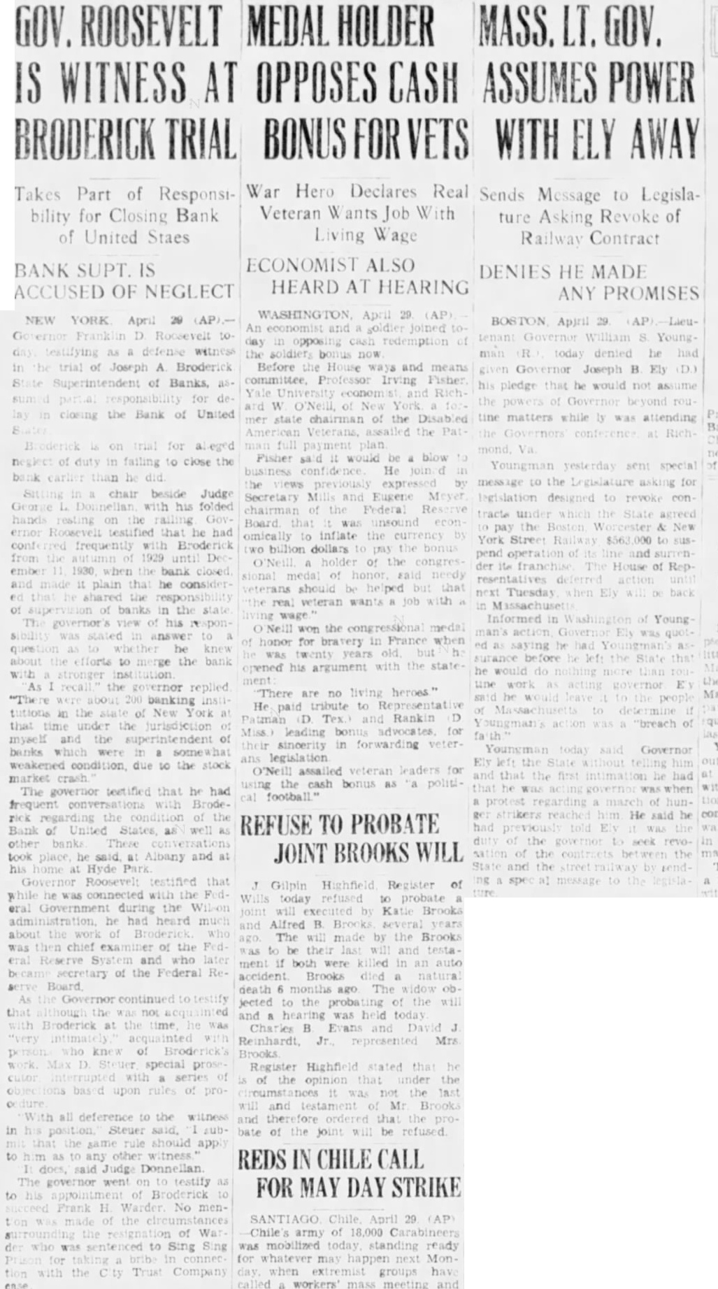 WASHINGTON April 29 NEW YORK April 29 An and joined Roosevelt day cash redemption witness the soldiers now in trial of Joseph Broderick Before House and means of Banks, committee, Professor Irving Fisher econom Richfor O'Neill, of New the Bank of United mer state chairman of the Disabled S American assailed the on for full payment Fisher would be blow of in failing to close the business He join than he he views previously expressed by chair beside Judge Meyer Secretary Mills and Eugene with his folded chairman of hands resting on unsound that was testified he had omically to inflate the by frequently Broderick the billion dollars pay bonus from 1929 holder of the bank closed of said needy and plain that he consider veterans should be that ed shared the responsibil real veteran wants of in the state wage The governor's his responwon the medal answer to of honor for bravery in France when question knew efforts to the bank his with the state opened argument with stronger ment As the governor replied "There are no about 200 banking insti He paid tribute to tutions in the of New York Patman D. and Rankin D that time under the jurisdiction of Miss. leading advocates for myself and superintendent of their sincerity in forwarding banks which were in somewhat ans legislation weakened due to the stock O'Neill assailed veteran for market crash using the cash bonus as The governor testified that he had cal football frequent conversations with Broderick regarding the condition of the REFUSE TO PROBATE Bank of United States, as well as other banks These conversations JOINT BROOKS WILL took place he said at Albany and at his home at Hyde Park Governor Roosevelt testified that of Gilpin while he was connected with FedWills today eral during the Wilson joint will he had heard much and Alfred about of Broderick who The by the Brooks chief examiner of the Fed was to was and eral and who later ment both in secretary of the Federal Reaccident Brooks died Board death The As to jected to the of the that the was not and was held today Broderick at time David Jr. represented Mrs of Brooks special prose- Register Highfield stated he cutor of of the the opinion upon of not the last was will and Brooks deference to the witness the and in his Steuer bate of the joint be to as to any other witness REDS IN CHILE CALL said Judge Donnellan The governor went on testify FOR MAY DAY STRIKE to of his Frank H. Warder No menof the Chile April 29 (AP) of Chile's army of 18,000 Carabineers de to Sing Sing was mobilized standing ready for whatever happen MonCity Trust Company day when groups tion case called a mass meeting and fa