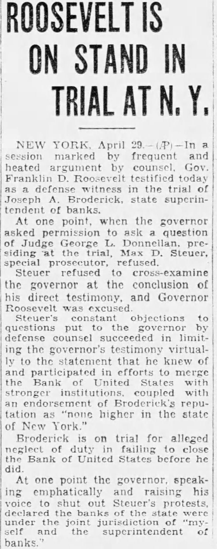 NEW April session marked frequent heated by Franklin testified today Joseph Broderick, superintendent banks. point, when the governor permission question Judge George Donnellan. siding trial, Steuer, special refused. Steuer refused the governor at the conclusion of direct and Governor Roosevelt excused Steuer's objections governor limitthe governor's testimony virtualstatement that he knew efforts to merge Bank United coupled with Broderick's tation as "none higher in the state of New York." Broderick trial for alleged neglect failing Bank of United States before he At point the speaking emphatically and raising his Steuer's under and banks.
