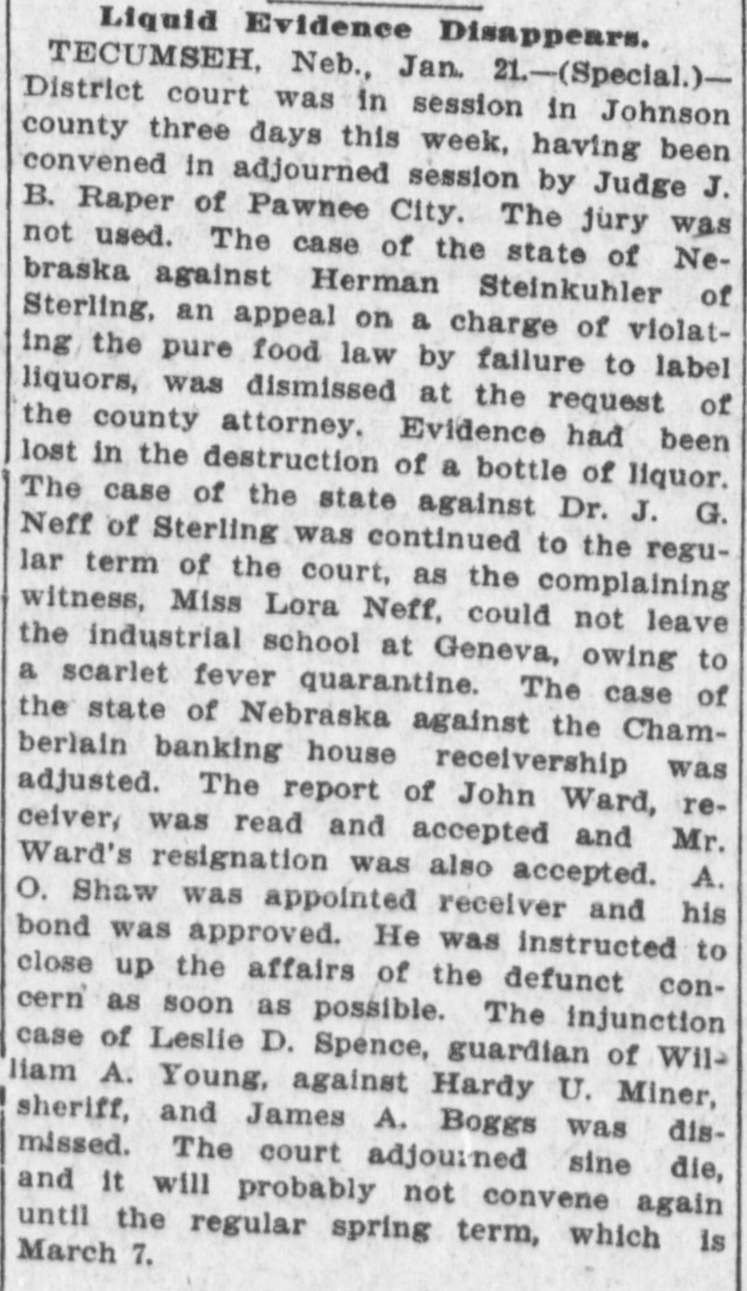 # Liquid Evidence Disappears. TECUMSEH, Neb., Jan. 21.-(Special.)- District court was in session in Johnson county three days this week, having been convened in adjourned session by Judge J. B. Raper of Pawnee City. The jury was not used. The case of the state of Nebraska against Herman Steinkuhler of Sterling, an appeal on a charge of violating the pure food law by failure to label liquors, was dismissed at the request of the county attorney. Evidence had been lost in the destruction of a bottle of liquor. The case of the state against Dr. J. G. Neff of Sterling was continued to the regular term of the court, as the complaining witness, Miss Lora Neff, could not leave the industrial school at Geneva, owing to a scarlet fever quarantine. The case of the state of Nebraska against the Chamberlain banking house receivership was adjusted. The report of John Ward, receiver, was read and accepted and Mr. Ward's resignation was also accepted. A. O. Shaw was appointed receiver and his bond was approved. He was instructed to close up the affairs of the defunct concern as soon as possible. The injunction case of Leslie D. Spence, guardian of William A. Young, against Hardy U. Miner, sheriff, and James A. Boggs was dismissed. The court adjourned sine die, and it will probably not convene again until the regular spring term, which is March 7.