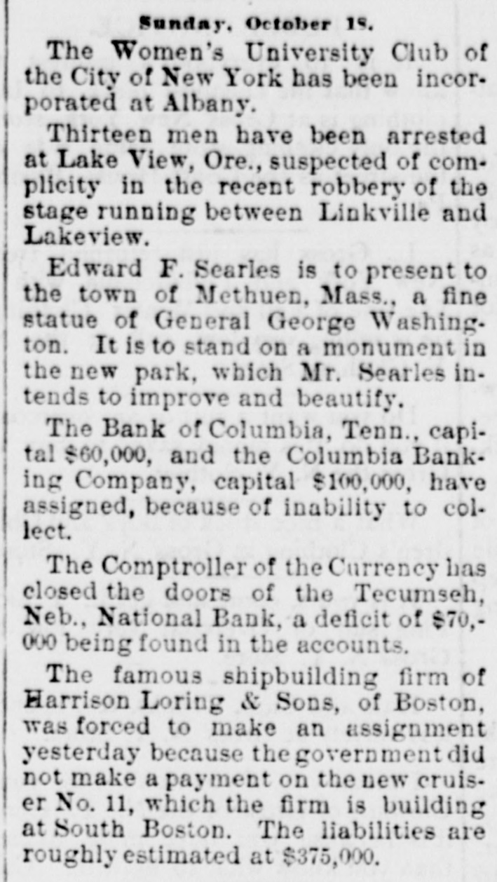 BUSINESS TROUBLES. Two Banks in Tennessee, One in Nobraska Fail-Other Assignments. NASHVILLE, Tenn., Oct. 17. 1:30 a. m.-A telephone message just received from Columbia, Tenn., says: The Columbia Banking Company. capital $100,000, and the Bank of Columbia, capital $60,000, both made assignments at midnight. There are no particulars except that the failure is caused by inability to collect. TECUMSEH, Neb., Oct. 16. - The Tecumseh National bank was closed today by Bank Examiner Griffith. The failure is not considered to be a bad one. Examiner Griffith is overhauling the accounts, in which there is said to be a deficit of $70,000. This has nearly all been made good by the officers of the bank, who have deeded over all their property. Bad investments are supposed to have caused the trouble. GAINESVILLE, Tex., Oct. 16.-Clever & Fletcher wholesale and retail hardware and agricultural implements, have failed. Assets, $235,000; liabilities, $200,000. CHICAGO, Oct. 16.-The Ayres and Wigant companies, piano and music dealers, assigned today Their liabilities and assets are estimated at $60,000 each.