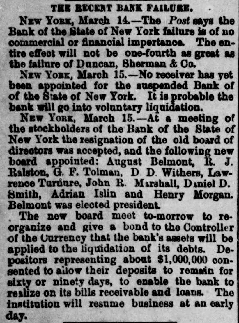 THE RECENT BANK FAILURE. NEW YORK, March 14.-The Post says the Bank of the State of New York failure is of no commercial or financial importance. The entire effect will not be one-fourth as great as the failure of Duncan, Sherman & Co. NEW YORK, March 15.-No receiver has yet been appointed for the suspended Bank of of the State of New York. It is probable the bank will go into voluntary liquidation. NEW YORK, March 15.-At a meeting of the stockholders of the Bank of the State of New York the resignation of the old board of directors was accepted, and the following new board appointed: August Belmont, R. J. Ralston, G. F. Tolman, D. D. Withers, Lawrence TurΓΊure, John R. Marshall, Daniel D. Smith, Adrian Islin and Henry Morgan. Belmont was elected president. The now board meet to-morrow to reorganize and give a bond to the Controller of the Currency that the bank's assets will be applied to the liquidation of its debts. Depositors representing about $1,000,000 consented to allow their deposits to remain for sixty or ninety days, to enable the bank to realize on its bills receivable and loans. The institution will resume business at an early day.