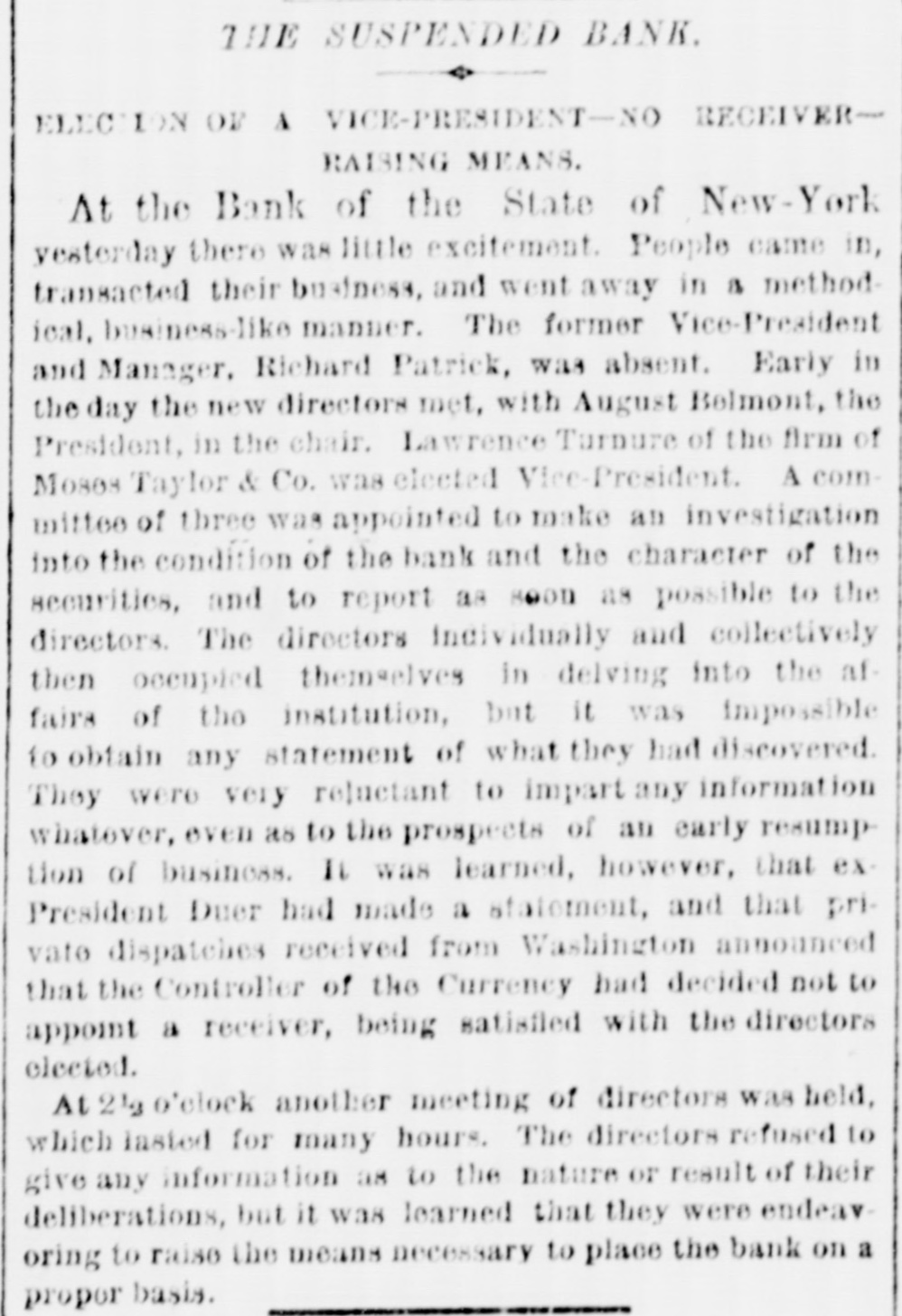 TORS AND CHOICE OF A NEWBOARD-ACGU BELMONT ELECTED PRESIDENT-EFFORTS TO PREVENT THE APPOINTMENT OF A RECEIVERTHE DECISION WHETHER TO RESUME OR LIQUIDATE BE MADE TO-DAY-RICHARD PATRICK STILL DECLINES TO MAKE A STATEMENT. The officers of the Bank of the State of NewYork concluded that it would be advisable to open the loors yesterday, if not for payment, at least for inquiry on the part of stockholders, depositors, and others intersted 111 the affairs of the bank. They were very cautious, however, only one section of the door being opened at a time; but as there was little excitement they decided to extend the aperture until the whole entrance was revealed. Two policement were stationed at the door check any possible demonstration, and to prevent the The entrance of people who had no business there. clerks were at work as usual, making up their accounts for the information of the directors, who were to meet later, to decide upon the proper course to be pursued. All day long there was a stream of inquirers calling to ask questions as to their balances and special deposite of securities, &c. Special deposits, of course, were exempt from any liability by the suspension, but the officers did not wish to give them up until the Banking Department at Washington had decided on some action n the matter. In the bank parlor directors and stockholders held informal conferences to exchange views. Mr. Duer acted RS 2 commitee of one to receive inquirers and lament the catas rophe which had overtaken the bank. In the clerical department of the institution could be seen the actual 55 head of the concern-Riehard Patrick. About r 60 years of age,six feet high, and broad in proportion. with head slightly bald and hair and whiskers tinged with gray, be was a very impressive looking bank officer. Ie attended to all the inquirers who had actual business o transact. He answered all questions that did not reate to the mismanagement of the bank, and he walked about the rooms with a placid, smiling countenance, sceningly acting the part of an adroit and trustworthy friend who had been called in at a critical moment and given complete control. Mr. Patrick, having disposed of a number of persons who were awaiting his attention, W28 asked to furnish the of with his statement of the causes of the failure and to explain theextraordinary pablic he bank, and loans which to himself he had made to Smith & Girvan of Broad st., and others. Mr. Patrick replied that he was too much engaged: that his time was occupted, and therefore he could not be expected to make a statement. Mr. Duer ad new information to give, Mr. Patrick having had of the business of the bank. and Later in the day matters barge knew no nothing. began the dire to grow tora actived, and although Mr. Patrick still had no statement. It was evident that more time was, if smake possible. Institution the August intention Belto rearimate the Bank mont, one of the largest stockholders was present. Meigs was offering the benefit of and President Vermilye of the bank officers also gave advice, and assistance the production of nce, and erial Examiner other upon Merchants proper his offered supported expert securi- Bank ma ies. At the request of the persons interested, y the Bank Examiner, Controller of the Currency Knox the appointment of a receiver in tiler the bank might go into voluntary raminer Meiga had stated that its obligations to 10303 but ad withheld to Hquidate however. depositors the liquidation. bank The and had Bank other Con- the preditors. This was not sufficient roller inviated that he should have a proper written custom tee that the integrity necessary for the applicathe assets to the payment The directors and themselve on paper. Controller that he must have this guarantee, and lebts o traphed ion commit existed of stockholders Knox hesitated the of after- tele the oon was spent in discussing the matter. According to an authoritative statement the obliga ions of the bank are about $3,000,000, in round numers. or this amount depositors representing $1,000, 00 have agreed to wait some time for their Against money. leaves about $2,000,000 be provided for. his there are $1,500,000 cash and the securities neces for the procuring of the deficiency of $500,000. if the necessary guarantee can be of the bank will RO apply all obligations on demand, managers Yow, ry guidate Controller obtained the but assets Knox will that allow as will the to grant the request not to appoint a receiver, be bank to liquidate and reorganize. At the meeting of be directors yesterday these facts were very clearly exrought out. The condition of the bank was also } ined in detail by Mr. Patrick CHANGING THE DIRECTORS. The deliberations long and earnest. and the result 1 their was that the directors concluded that the best them to would be to retire, and enable business sagacity was not Accordingly George W. Duer, Vice-President. Isaac H. hing hour uen whose places. for impaired Reed, President, resigned, to John take A.M. Proudat, and Lloyd Aspiawall dehard steward. Patrick. of the bank 11 dividually and collectively, as directors Board of in their places were installed the following D. ore: August Belmont, George F. Talman, Henry Morgan. R G. Rolston, D. John R Marshall, and Lawrence Turnure. selin, Diree withers, D. offices Smith, August were A. selmont was elected President, and the other eft August vacant Belmont, for the present. as is well known is the ageat of the tothschilds in this country. R. G. Relston is President if the Farmers' Loan and Trust Company, and the other This ew directors are very wellknown business men. have change in control was deemed essential, as It would eep impossible for the bank to get back to the Clearing it even with Mr. Patrick as s manager. Nor could of cause egain popular confidence as long as the same Board Directors remained in office. A meeting of the new directors will be held this decide more to examine the affairs of the bank and to ng wh