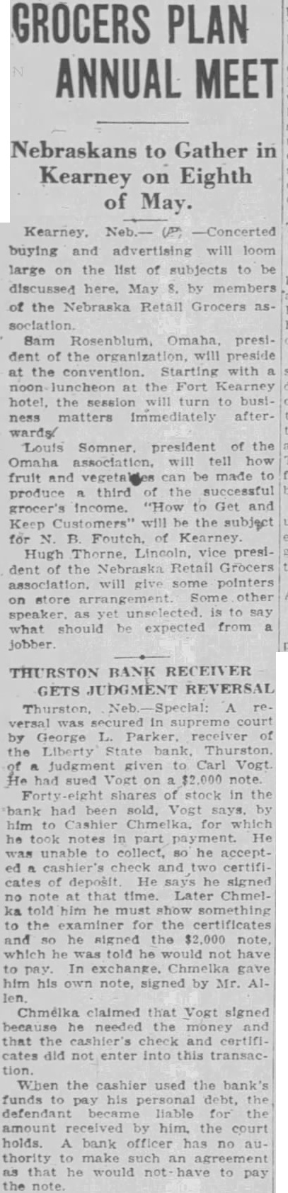 GROCERS PLAN ANNUAL MEET Nebraskans to Gather in Kearney on Eighth of May. Kearney. Neb.- -Concerted buying and advertising will loom large on the list of subjects to be discussed here. May by members of the Nebraska Retail Grocers association dent of the organization. will preside at the convention. Starting with noon luncheon at the Fort Kearney the will turn to business matters Immediately afterLouis Somner president of the Omaha association. will tell how fruit and can be made to third successful produce grocer's income. "How Get and Keep will be the subject for Foutch. Hugh Thorne, vice president the Nebraska Retail Grocers association. will give some pointers store arrangement other on speaker. say what should be expected from jobber THURSTON BANK RECEIVER GETS JUDGMENT REVERSAL versal was In supreme court by George Parker. the Liberty State bank, Thurston judgment given to Carl Vogt had sued Vogt on note Forty shares stock in the bank had been sold, Vogt says. by him to Cashier Chmelka, which he took notes in part He was unable to collect, he cashier's check and two certificates of deposit He says he signed note that time. Later Chmeltold he must show something the examiner for the certificates and he signed the note, which he was told he would not have In exchange. Chmelka gave him his own note, signed by Mr. A1Chmelka claimed that Vogt signed because he needed the money and that the cashier's check and certificates did not enter into this transaction. When the cashier used the bank's funds pay his personal debt. defendant liable for the amount received by him. the court holds. bank officer has no thority make such an agreement that he would to pay the