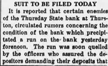 SUIT TO BE FILED TODAY It is reported that certain enemies of the Thursday State bank at Thurston, circulated rumors concerning the condition of the bank which precipitated a run on the bank yesterday forenoon. The run was soon quelled by the officers who assured the depositors demanding their deposits that