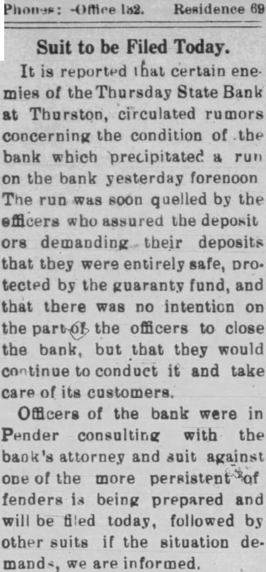 It is reported that certain ene. mies of the Thursday State Bank at Thurston, circulated rumors concerning the condition of the bank which precipitated a run on the bank yesterday forenoon The run was soon quelled by the officers who assured the deposit ors demanding. their deposits that they were entirely safe, pro. tected by the guaranty fund, and that there was no intention on the part-of the officers to close the bank, but that they would continue to conduct it and take care of its customers. Officers of the bank were in Pender consulting with the bank's attorney and suit against one of the more persistent of fenders is being prepared and will be filed today, followed by other suits if the situation demands, we are informed.