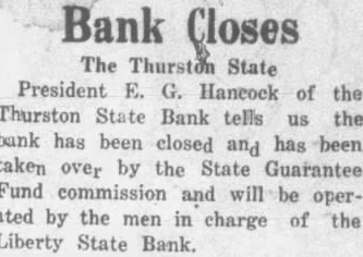 Bank Closes The Thurston State President E. Haneock of the Thurston State Bank tells us the bank has been closed and has been taken over by the State Guarantee Fund commission will be and operated by the men in charge of the Liberty State Bank.