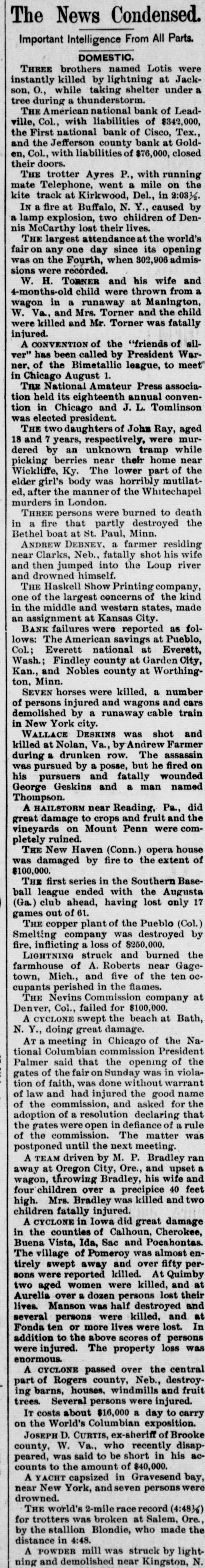 THE two daughters of John Ray, aged 18 and 7 years, respectively, were murdered by an unknown tramp while picking berries near their home near Wickliffe, Ky. The lower part of the elder girl's body was horribly mutilated, after the manner of the Whitechapel murders in London.