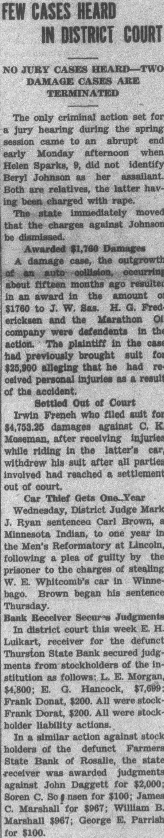 CASES DISTRICT NO JURY CASES DAMAGE CASES ARE TERMINATED The only criminal action set for jury hearing during the spring session came to an abrupt end early Monday afternoon when Helen Sparks, did not identify Beryl Johnson as her assailant. Both are relatives, the latter having been charged with rape. state immediately moved that the charges against Johnson be dismissed. Awarded Damages damage case, the outgrowth occurring about fifteen months ago resulted in an award in the amount of $1760 to Sas. H. Fredericksen and the Marathon Oil company were defendents in the action. The plaintiff in the case had previously brought suit for $25,900 alleging that he had received personal injuries as result of the accident. Settled Out of Court Irwin French who filed auit for $4,753.25 damages against C. K. Moseman, after receiving injuries while riding in the latter's car, withdrew his suit after all parties involved had reached settlement out of court. Car Thief Gets Wednesday, District Judge Mark Ryan sentenced Carl Brown, Minnesota Indian, to one year in the Men's Reformatory at Lincoln, following plea of guilty by the prisoner to the charges of stealing W. E. Whitcomb's car in Winnebago. Brown began his sentence Thursday. Bank Receiver Secures Judgments In district court this week H. Luikart, receiver for the defunct Thurston State Bank secured judgments from stockholders of the institution as follows: E. Morgan, $4,800; E. G. Hancock, $7,699; Frank Donat, $200. All Frank Dorat, $200. All were stockholder liability actions. In similar action against stock holders of the defunct Farmers State Bank of Rosalie, the state receiver was awarded judgments against John Daggett for $2,000; Soren C. for $100; James C. Marshall for $967; William B. Marshall $967; George E. Parrish for $100.