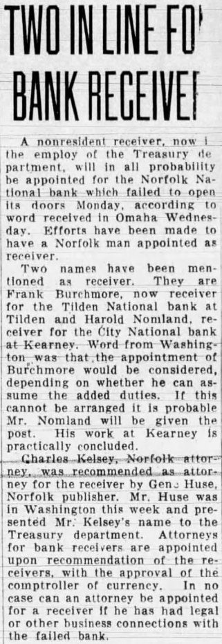 nonresident receiver. the employ the Treasury partment, will in all probability appointed for the Norfolk National bank which failed to open its doors Monday word received in Omaha day. Efforts made Norfolk man appointed receiver Two names have been mentioned receiver. They are Frank Burchmore, now receiver for the Tilden National bank Tilden and Harold Nomland. ceiver for the City National bank Kearney. Word from Washingthat the appointment Burchmore would be considered, depending on whether he can sume the added duties. this cannot arranged probable Mr. Nomland will be given the post. His work Kearney practically concluded for the receiver by Gens Huse, Norfolk publisher. Mr. Huse was in Washington this week and presented Mr. Kelsey's to the Treasury department. Attorneys for bank receivers are appointed upon of the with the approval the comptroller be appointed for he has had legal business connections with the failed bank