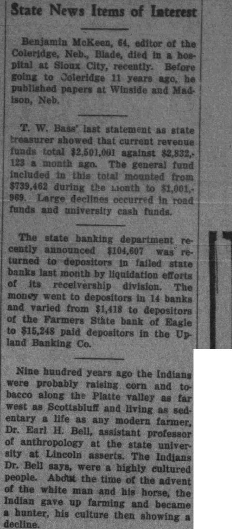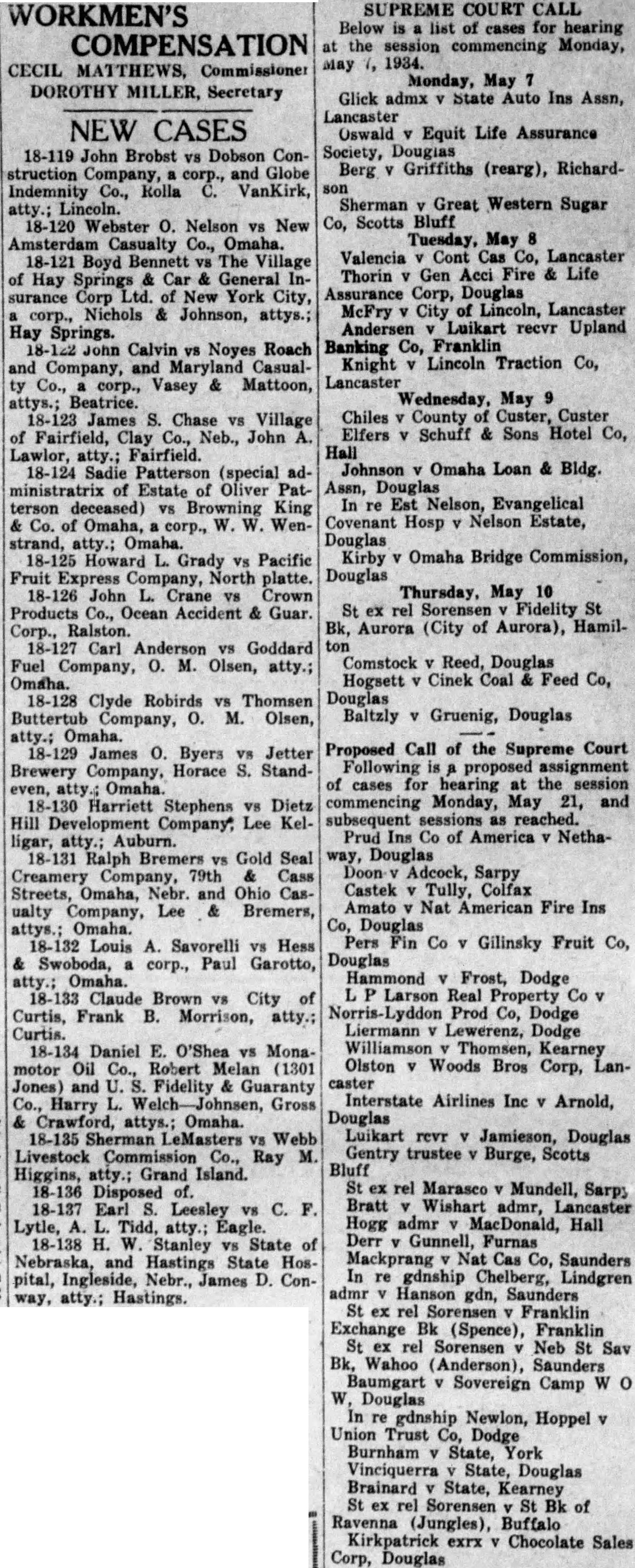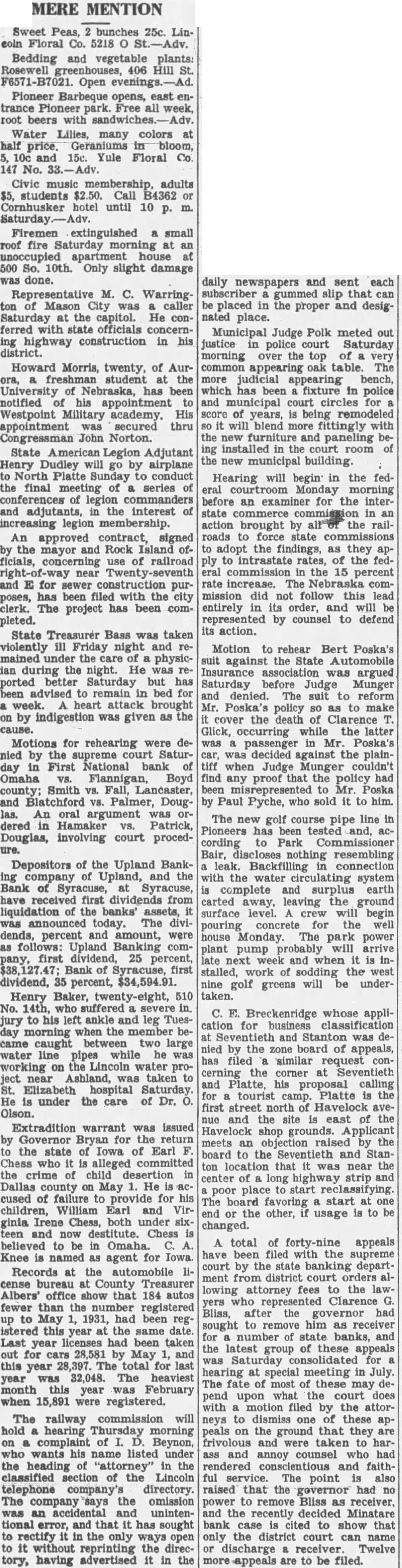 MERE MENTION Sweet Peas, bunches 25c. Lincoin Floral Co. 5218 Bedding and vegetable plants: 406 Hill St. Open Pioneer opens, enFree all week, root beers with Water Lilies, many colors at half price. 10c 15c. Yule Floral Co. 147 No. Civic music adults $5, students Call B4362 hotel until 10 m. extinguished small roof fire at an house 500 So. 10th Only slight damage done. Representative M. C. Warrington of Mason City caller Saturday at the capitol. He conferred state officials ing highway construction in his district. Howard Morris, twenty, of Aurat the of has notified his Westpoint academy. His appointment secured thru Congressman John Norton. State Legion Adjutant Henry Dudley by airplane North Platte conduct the final of series and adjutants, the interest of legion membership. An approved contract, signed by the mayor and Rock Island ficials, use of railroad near and E for purhas been the city clerk. The project has been completed. State Treasurer Bass was taken violently ill mained the physician the night. He reported Saturday but has advised to remain bed for heart attack brought on indigestion was given as cause. Motions for rehearing were denied Saturday First National bank Omaha Flannigan, Boyd county; Smith vs. Lancaster, and Palmer, DougAn argument Patrick, Douglas, involving court procedure. Depositors of the Upland BankUpland, the Syracuse, Syracuse, first from liquidation banks' assets, today. The dividends, percent and amount, were follows: Upland Banking company, first dividend, 25 percent, Bank Syracuse, first dividend, 35 percent, $34,594.91. Henry Baker, twenty-eight, 510 14th, who suffered severe in. jury to his left ankle and leg Tuesday morning when the member became caught between two large water pipes while he was working on the Lincoln project Ashland, taken to Elizabeth Saturday. He under the care of Dr. Olson. Extradition warrant was issued Governor for return the state of Iowa of Earl Chess alleged the crime child May He cused of failure for children, William and Virginia Irene Chess, both under sixand Chess believed to be Omaha. Knee is named agent for Iowa. Records at the liAlbers' office that 184 autos fewer than the registered to May had been registered year the same date. Last year had been taken out for 28,581 May this year 28,397. total for last year was 32,048. The heaviest month this year February when 15,891 were registered. The railway commission will hold hearing of Beynon, wants his under the heading "attorney" in the classified Lincoln company's directory. The the omission an unintentional error, and that has sought rectify the only ways without the directory, having advertised it in the daily newspapers and sent each slip that be placed the proper and designated place. Municipal Judge Polk meted out justice police Saturday morning over top appearing table. more appearing bench, which fixture in police court for of years, will blend fittingly with the and paneling being the room new building. Hearing will begin in the federal morning before an for the interstate brought by all of the railroads state adopt the findings, as they apply rates, of the fedcommission the 15 percent rate mission follow this entirely its order, and will represented counsel to defend its action. Motion rehear Bert Poska's against the State Automobile argued Saturday before Judge Munger denied. suit to reform Mr. Poska's policy to make cover the death occurring the latter Poska's decided against the plainwhen Judge any proof that the policy had misrepresented Mr. Poska by Paul Pyche, who sold it to him The new golf course pipe line in Pioneers has tested and, according Park Bair, resembling Backfilling connection with the water system complete and surplus earth carted leaving the ground surface level. crew will begin pouring concrete house Monday. park power plant pump will arrive next and when stalled, work of sodding the west nine golf greens undertaken. E. Breckenridge whose applifor and Stanton was denied by the board appeals, filed similar the corner at Seventieth and Platte, his proposal calling for tourist camp. Platte the first street north Havelock aveand the site east the Havelock shop grounds. Applicant meets an raised the board the Seventieth and Stanton location was near the center long highway strip poor place reclassifying. The favoring start one the other, usage is to changed. total appeals have filed with supreme court by the state banking department from district court orders lowing attorney the yers Clarence Bliss, after the governor had sought remove receiver for number state banks, the latest group these appeals was consolidated for at meeting in July The of most of these may upon what the with filed by the attorneys to one these appeals the that they frivolous and taken to har ass and faithful service. The point is also raised that the governor had power to Bliss receiver, and the recently Minatare bank case cited show that only the court can name or discharge Twelve more appeals are to be filed.