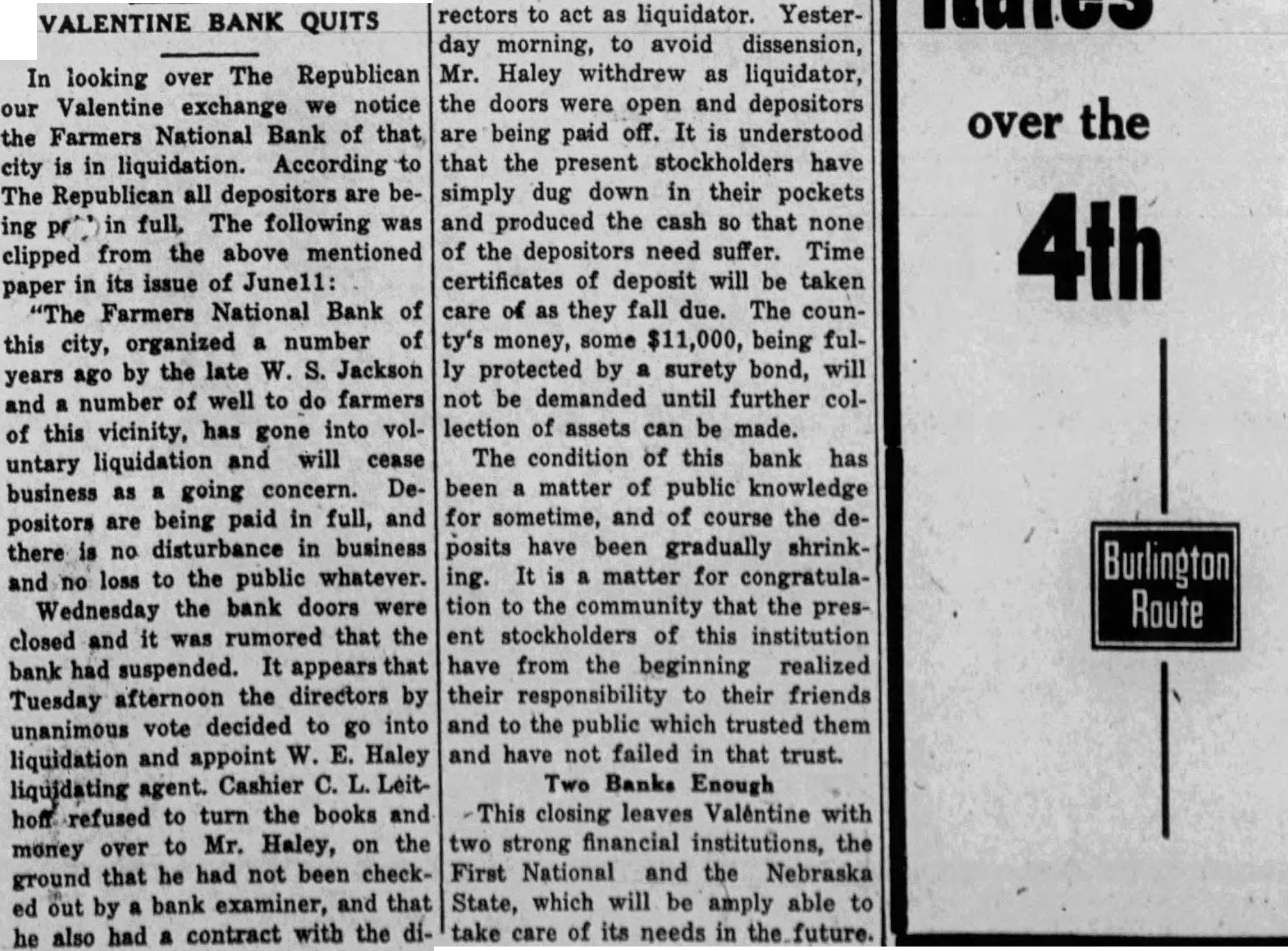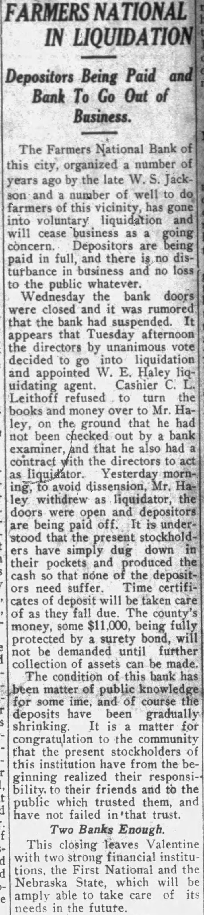 IN LIQUIDATION Depositors Being Paid Bank To Go Out of Business. The Farmers National Bank of this city, organized a number of years ago by the late Jackson and a number of well to do farmers of this vicinity, has gone into voluntary liquidation and will cease business as a going còncern. Depositors are being paid in full, and there is no disturbance in business and no loss to the public whatever. Wednesday the bank doors were closed and it was rumored that the bank had suspended. It appears that Tuesday afternoon the directors by unanimous vote decided to into liquidation and appointed W. E. Haley uidating Cashier C. agent. Leithoff refused to turn the books and money over to Mr. Haley, on the ground that he had not been checked out by a bank examiner, and that he also had contract with the directors to act Yesterday morning, to avoid dissension, Mr. Haley withdrew as liquidator, the doors were open and depositors are being paid off. It is understood that the present stockholders have simply dug down in their pockets and produced the cash so that none of the depositors need suffer. Time certificates of deposit will be taken care of as they fall due. The county's money, some $11,000, being fully protected by a surety bond, will not be demanded until further collection of assets can be made. The condition of this bank has been matter of public knowledge for some ime. and of course the deposits have been gradually shrinking. It is a matter for congratulation to the community that the present stockholders of this institution have from the beginning realized their responsibility. their friends and to the public which trusted them, and have not failed 'that trust. Two Banks Enough. This closing leaves Valentine with two strong financial institutions, the First National and the Nebraska State, which will be amply able to take care of its needs in the future.