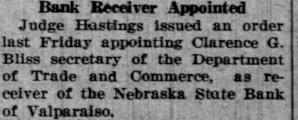Bank Receiver Appointed Judge issued order last Friday appointing Clarence secretary of the Department Trade Commerce, as ceiver the Nebraska State Bank of Valparaiso.