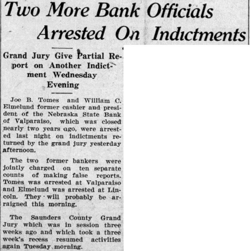 Officials Arrested On Indictments Grand Jury Give port on Another Indictment Wednesday Evening Joe Tomes and Elmelund former and dent the Nebraska State Bank of Valparaiso, which was closed nearly years ago, were arrested last night indictments turned the grand jury yesterday afternoon. The two former bankers jointly charged on ten separate counts of making false reports. Tomes arrested at Valparaiso and Elmelund was arrested coln. They will probably be raigned this morning. The Saunders County Grand Jury which was in session three ago and which took three week's recess resumed activities