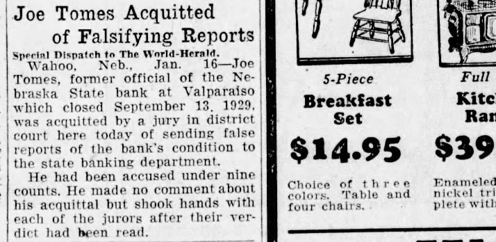Joe Tomes Acquitted of Falsifying Reports Neb., Jan. Tomes, former official of the Ne- 5-Piece braska State bank at Valparaiso Breakfast which closed September 13. 1929. was acquitted by jury in district Set court here today sending false reports of the bank's condition to $14.95 the state banking department. He had been accused under nine Enameled Choice counts. He made no comment about colors. Table and his acquittal but shook hands with four each of the after their verjurors dict had been read.