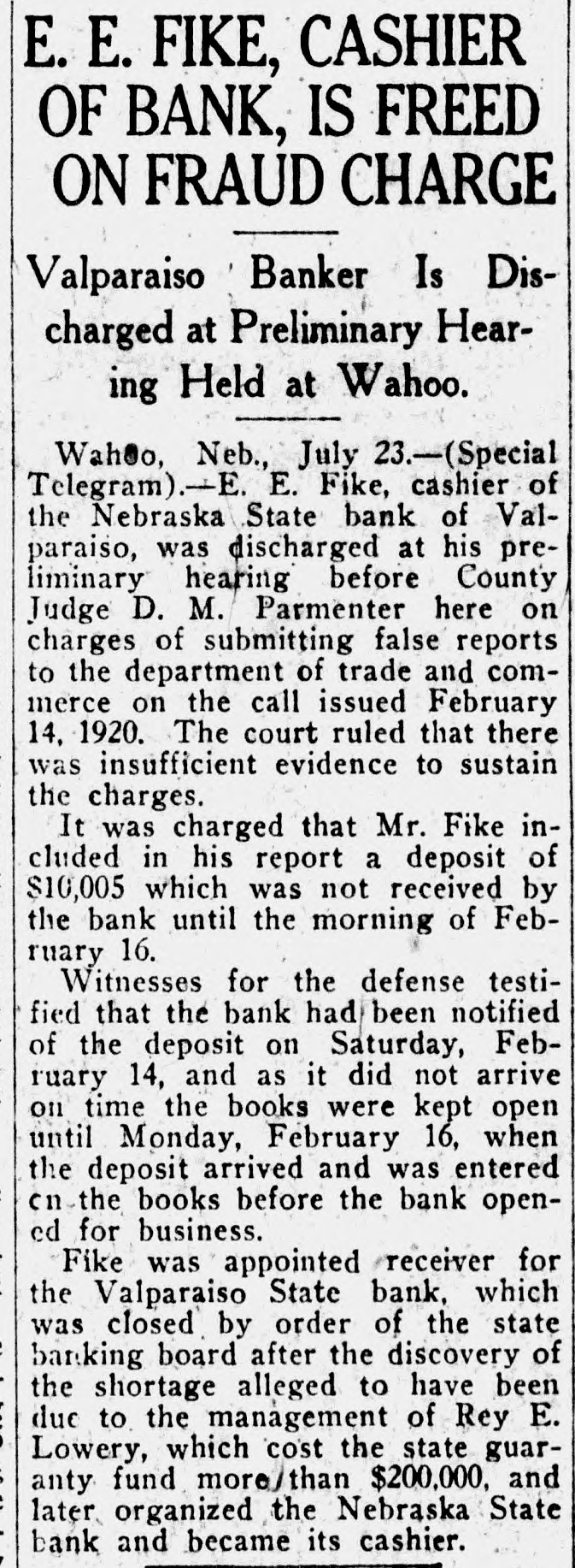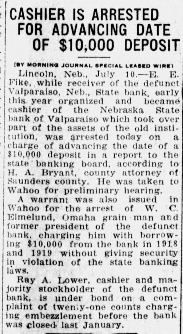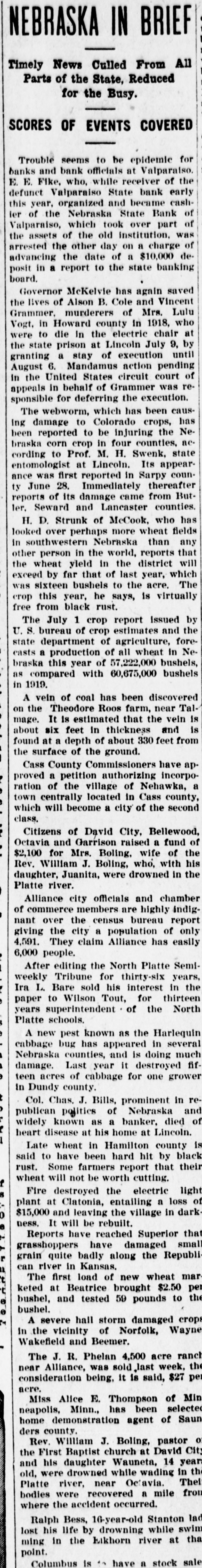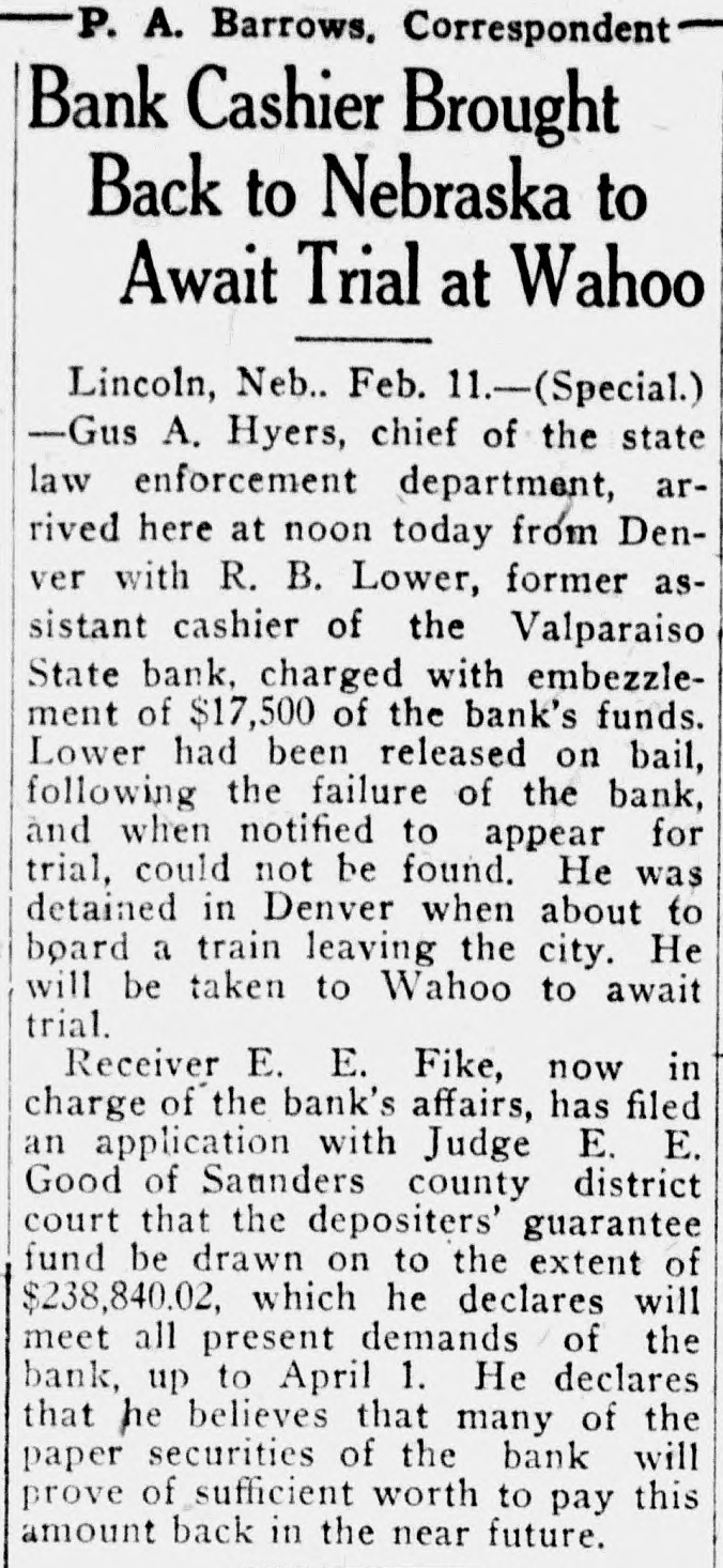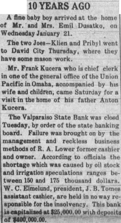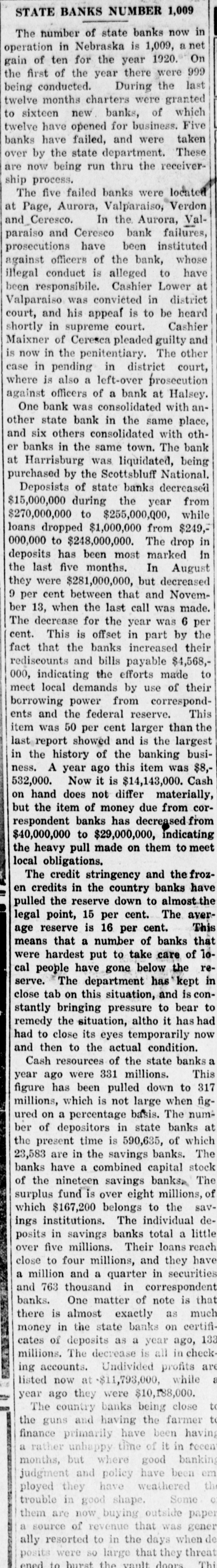 STATE NUMBER now banks number of state is 1,009, a On operation the were 999 The of ten in for Nebraska year there 1920. gain first of the year During the last the being conducted. charters were of granted which twelve new Five have sixteen have months banks, business. to opened for were taken by the state thru the over banks twelve being failed, run department. and receiver- These are ship process. failed banks were Verdon the Aurora, Ceresco. bank at The Page, now five Aurora, In Valparaiso, failures, located Valand Ceresco instituted paraiso and been whose prosecutions have of the bank, to have against conduct officers is alleged Lower at illegal Cashier in district been was is to be court, Valparaiso responsibile. and supreme his appeal court. Cashier heard and shortly in pleaded guilty of Ceresca The other Maixner in the penitentiary. district court, case is now in is pending also a left-over in prosecution at Halsey. where of a bank anagainst officers consolidated with One bank was in the same place, othothers The other and six state bank consolidated same town. with being bank banks in the liquidated, at er Harrisburg was Scottsbluff National. purchased by of the state banks decreased from Deposists during the year while $15,000,000 to $255,000,000, from $249,2 loans $270,000,000 dropped $1,000,000 The drop in to most has In last five but deposits 000,000 $248,000,000. been months. marked decreased August in were that and they the cent $281,000,000, between call was Novem- made. per when the last was 6 decrease in part is offset The 9 ber 13, for the year increased by their per the cent. This the banks $4,568, fact that bills payable to rediscounts and efforts made their indicating the by use of 000, local demands from correspondborrowing meet power federal reserve. than This the ents and the 50 per cent larger the largest item was and is busibanking the history item was report showed of the this $8, 532,000. in A year ago $14,143,000. Cash ness. Now it is differ materially, hand does not due from coron but the item of money has decreased from respondent banks $29,000,000, indicating to meet $40,000,000 the heavy pull to made on them local obligations. credit banks have The stringency country and the frozthe almost the point, en reserve The averpulled credits the in 15 per down cent. cent. to This legal reserve is 16 per of banks that means age that a number to take care of 10- rewere hardest put below the cal people The have department gone has and kept is con- in close serve. tab on this situation, pressure to bear to stantly bringing the situation, temporarily altho it has now had had remedy to close its eyes actual condition. and then to the of the state banks a This Cash resources were 331 millions. year ago been pulled down when to 317 figfigure has which is not large The nummillions, a percentage basis. state banks at of 590,635, of ber ured present on depositors time is in banks. which The 23,583 the are in the combined savings capital stock banks of the have nineteen a savings eight banks millions, The $167,200 belongs surplus fund is over individual to the sav- de- of which institutions. The little ings in savings banks total loans a reach five millions. they have to four in posits over close and millions, a quarter Their and securities correspondent a million 763 thousand in of note is that and banks. One matter exactly as much almost certifimoney there is in the state banks year on ago, 133 cates of is all millions. deposits The decrease Undivided as a profits in check- are ing accounts. -$11,793,000, while listed now at were $10,188,000. to year ago they banks being close to The country the farmer the guns and having have been having finance rather primarily unhappy time good of it in bankin recen months, a but where have been ployed judgment they and have policy weathered Some trouble in good shape. outside paper now buying was gener them source are of revenue that when de to in the days threat ened ally resorted so large that they posits were burst the vault doors to