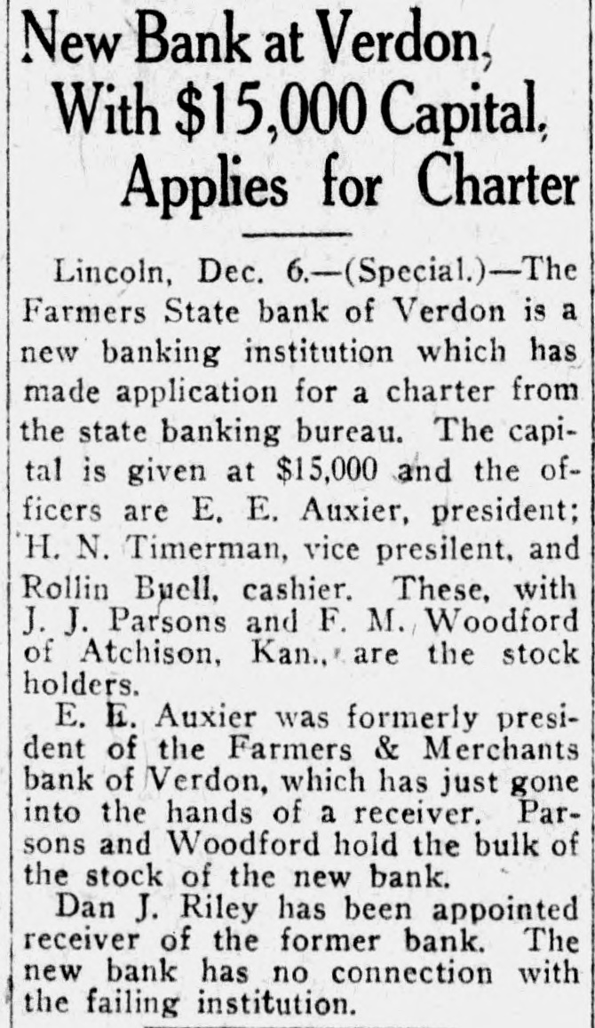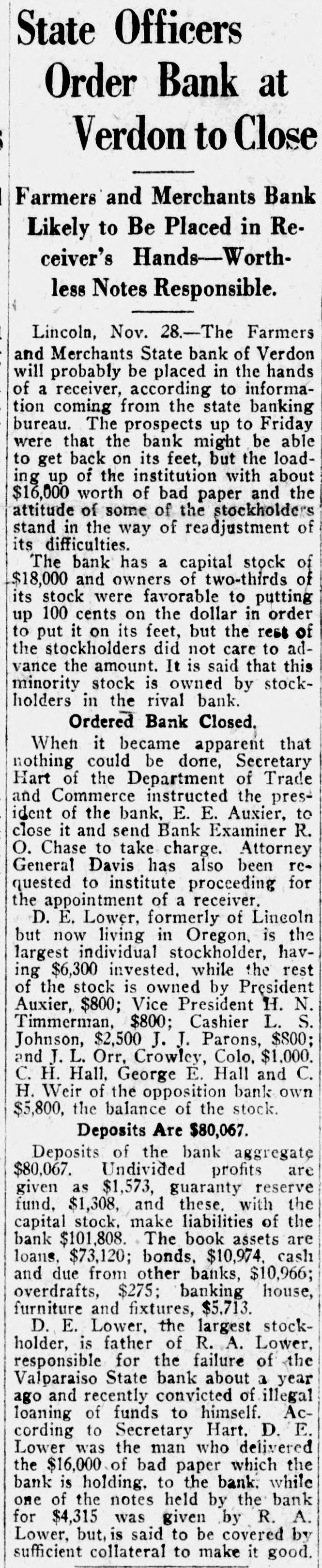 State Officers Order Bank at Verdon to Close Farmers and Merchants Bank Likely to Be Placed in Receiver's Hands-Worthless Notes Responsible. Lincoln, Nov. 28.-The Farmers and Merchants State bank of Verdon will probably be placed in the hands of a receiver, according to information coming from the state banking bureau. The prospects up to Friday were that the bank might be able to get back on its feet, but the loading up of the institution with about $16,000 worth of bad paper and the attitude of some of the stockholders stand in the way of readjustment of its difficulties. The bank has a capital stock of $18,000 and owners of two-thirds of its stock were favorable to putting up 100 cents on the dollar in order to put it on its feet, but the rest of the stockholders did not care to advance the amount. It is said that this minority stock is owned by stockholders in the rival bank. Ordered Bank Closed. When it became apparent that nothing could be done, Secretary Hart of the Department of Trade and Commerce instructed the president of the bank, E. E. Auxier, to close it and send Bank Examiner R. O. Chase to take charge. Attorney reto for quested General Davis institute has proceeding also been the appointment of a receiver. D. E. Lower, formerly of Lincoln but now living in Oregon, is the largest individual stockholder, having $6,300 invested. while the rest of the stock is owned by President Auxier, $800; Vice President H. N. Timmerman, $800; Cashier L. S. Johnson, $2,500 J. J. Parons, $800; and J. L. Orr, Crowley, Colo, $1,000. C. H. Hall, George E. Hall and C. H. Weir of the opposition bank own $5,800, the balance of the stock. Deposits Are $80,067. Deposits of the bank aggregate $80,067. Undivided profits are given as $1,573, guaranty reserve fund, $1,308, and these. with the capital stock. make liabilities of the bank $101,808. The book assets are loans, $73,120; bonds. $10,974. cash and due from other banks, $10,966; overdrafts, $275; banking house, furniture and fixtures, $5.713. D. E. Lower. the largest stockholder, is father of R. A. Lower. responsible for the failure of the Valparaiso State bank about a year ago and recently convicted of illegal loaning of funds to himself. According to Secretary Hart. D. E. Lower was the man who delivered the $16,000 of bad paper which the bank is holding, to the bank. while one of the notes held by the bank for $4,315 was given by R. A. Lower, but, is said to be covered by sufficient collateral to make it good.