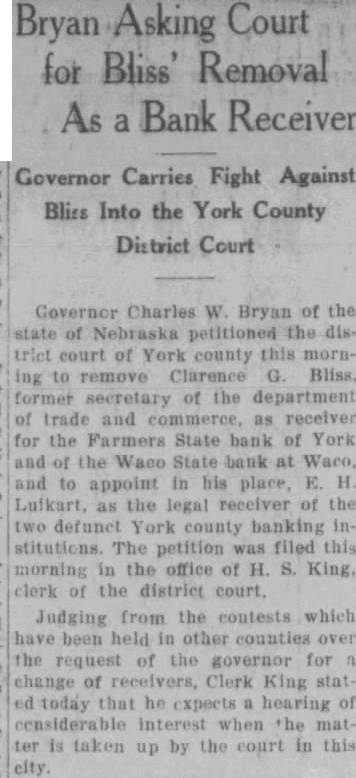 Asking for Bliss' Removal As Bank Receiver a Governor Carries Fight Against Bliss Into the York County District Court Governor Charles Bryan of of Nebraska petitioned the court of York county this remove Clarence former of the department trade and as receiver the Farmers State bank of York the Waco State bank at Waco, to appoint in his place, Luikart, as the legal receiver of the defunct York county banking stitutions. The petition was filed this morning the office of King, clerk of the district court. Judging from the contests which been held in other counties the request of the governor for change of receivers, Clerk King stat today that he expects hearing interest when the mat by the court in city