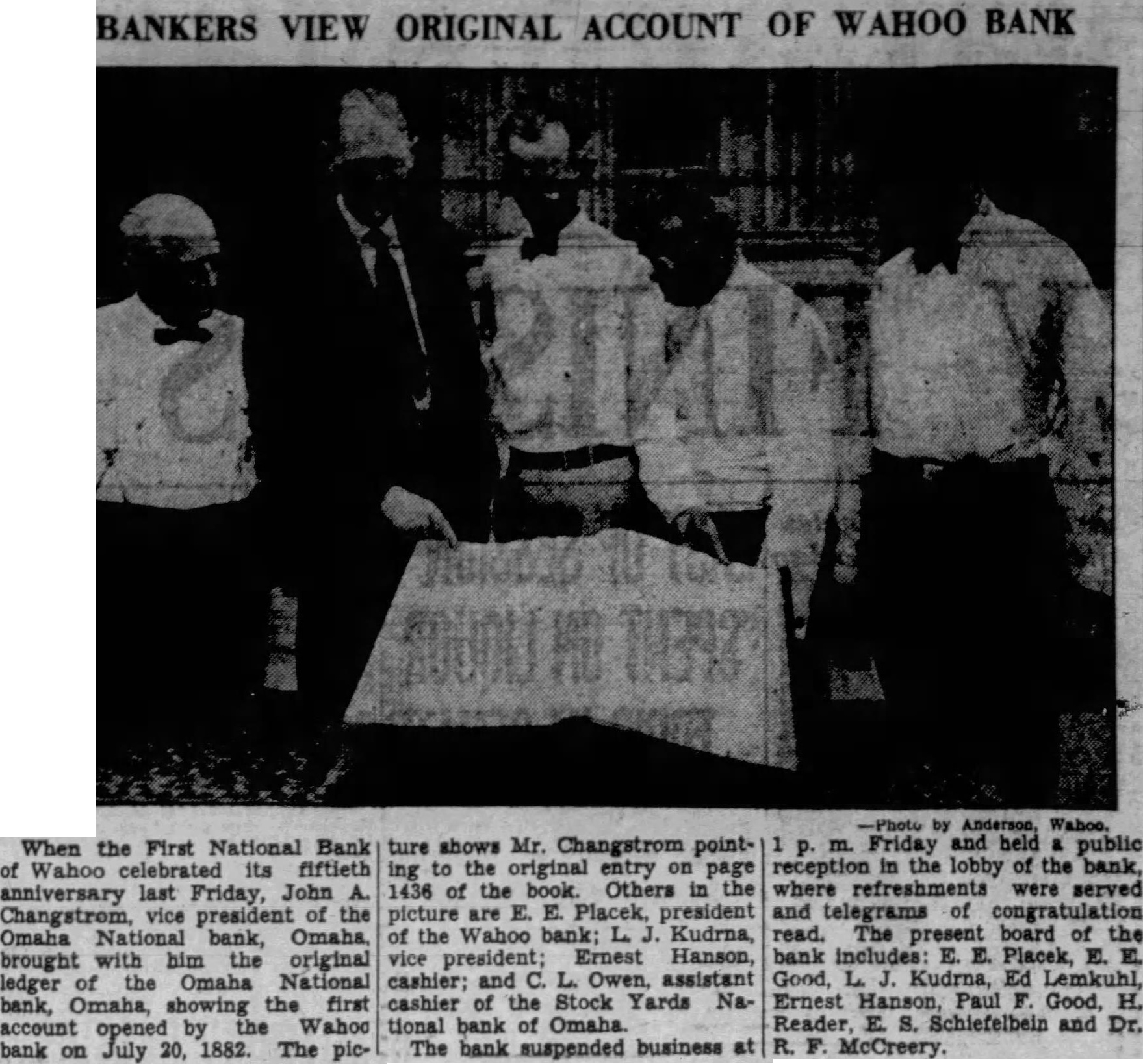 BANKERS VIEW ORIGINAL ACCOUNT OF WAHOO BANK When the First National Bank of Wahoo its fiftieth anniversary last Friday, John Changstrom, vice president of the Omaha National bank, Omaha, brought with him the original ledger of the Omaha National bank, Omaha, showing the first account opened by the Wahoo bank on July 20, 1882. The pic- ture shows Mr. Changstrom pointing to the original entry on page 1436 of the book. Others in the picture are E. E. Placek, president of the Wahoo bank; L. J. Kudrna, vice president; Ernest Hanson, cashier; and C. L. Owen, assistant cashier of the Stock Yards National bank of Omaha. The bank suspended business at m. Friday and public in the lobby of the bank, where refreshments were served and telegrams of congratulation read. The board of the bank includes: E. E. Placek, E. EL Good, L. J. Kudrna, Ed Lemkuhl, Ernest Paul Good, H. Reader, E. S. Schiefelbein and Dr. R. F. McCreery.