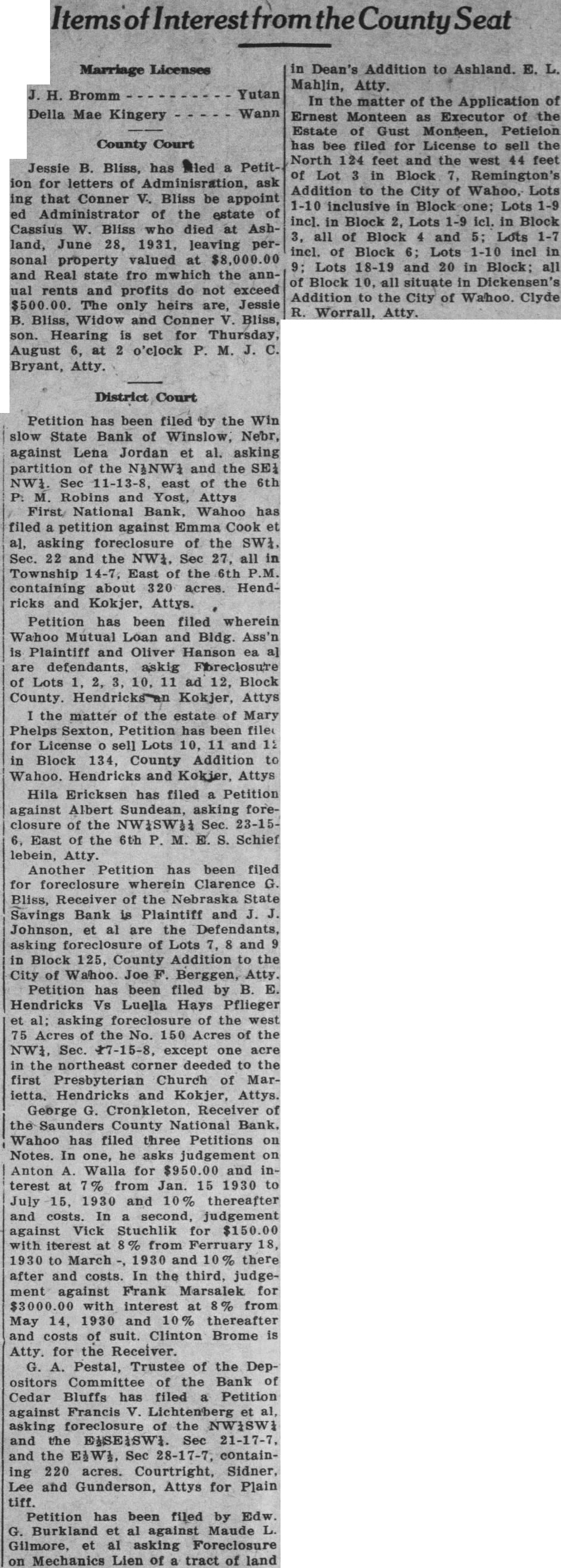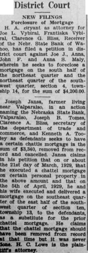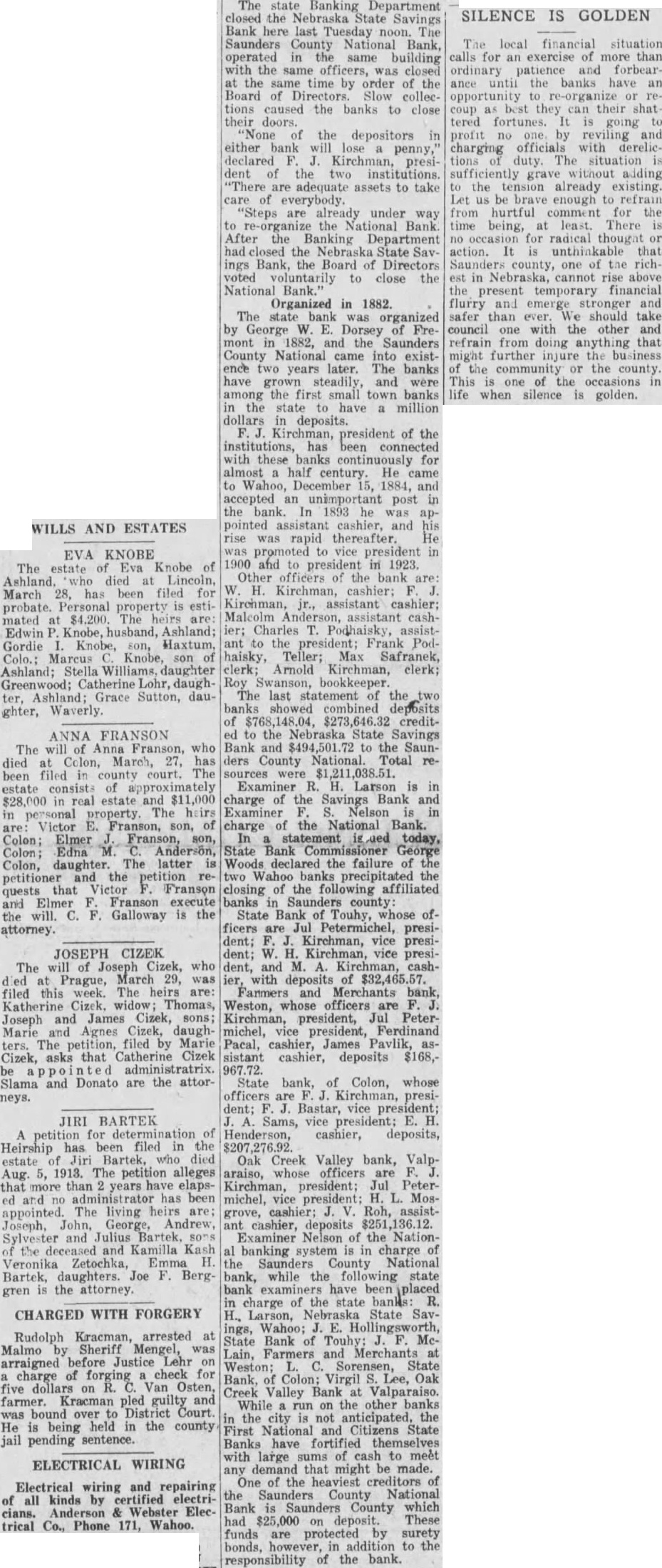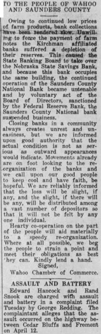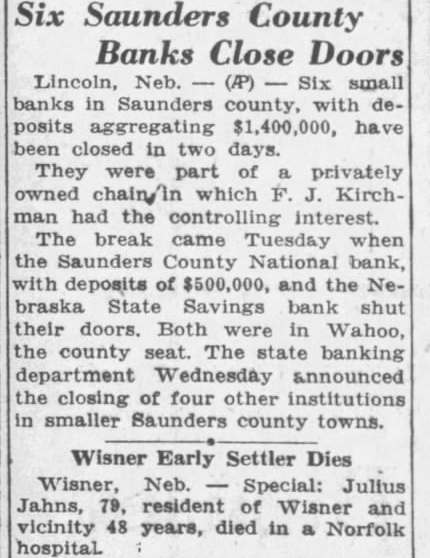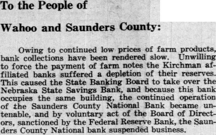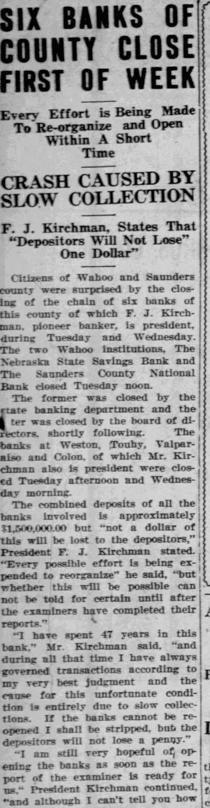 The state Banking Department closed the Nebraska Savings Bank here last Tuesday The Saunders County National Bank, operated same building the same officers, was closed the same time by order the Board Directors. Slow collections caused the banks to close doors. the depositors either penny, declared presithe two institutions. "There are adequate assets to take under the Bank After Banking the Sav ings Bank, the Board of Directors voted to close the National Organized in 1882. The bank organized by George Dorsey of mont 1882, Saunders County National came into existence two years later. banks have steadily, and were among the first small town banks state have million dollars deposits. Kirchman, president of the institutions, connected these banks continuously for almost half century. He came Wahoo, December 1884, and accepted unimportant post the bank. 1893 he pointed assistant cashier, and rise rapid thereafter. promoted vice president 1900 president 1923. Other officers the Kirchman, cashier: Malcolm cashCharles ant the Podhaisky, Teller; Max clerk; Arnold Kirchman, clerk; Roy The last statement the $273,646.32 creditthe Nebraska State Savings Bank and the Saunders County National. Total Examiner Larson charge the Savings Bank Examiner charge of the National Bank. today, State Bank George Woods declared the failure of Wahoo banks precipitated the closing of the following affiliated banks Saunders county: State Bank Touhy, ficers Petermichel, president; Kirchman, president; Kirchman, president, and and bank, Weston, whose officers Kirchman, president, Petermichel, president, Ferdinand Pacal, cashier, James Pavlik, sistant cashier, deposits $168,State bank, of Colon, whose officers are president; Bastar, Sams, vice Henderson, cashier, deposits, Oak Creek Valley bank, araiso, whose officers Kirchman, president; Jul Petermichel, Moscashier; Roh, assistgrove, cashier, deposits Examiner Nelson the Nationbanking system charge Saunders County bank, while the state charge the state Larson, State SavBank Farmers and Merchants Sorensen, State Bank, Virgil Oak Creek Valley Bank Valparaiso. While the other banks the First and Citizens State Banks fortified with large sums cash to meet demand that might made. One the heaviest creditors Saunders County National Bank Saunders County which $25,000 These funds protected by surety bonds, the responsibility the bank.