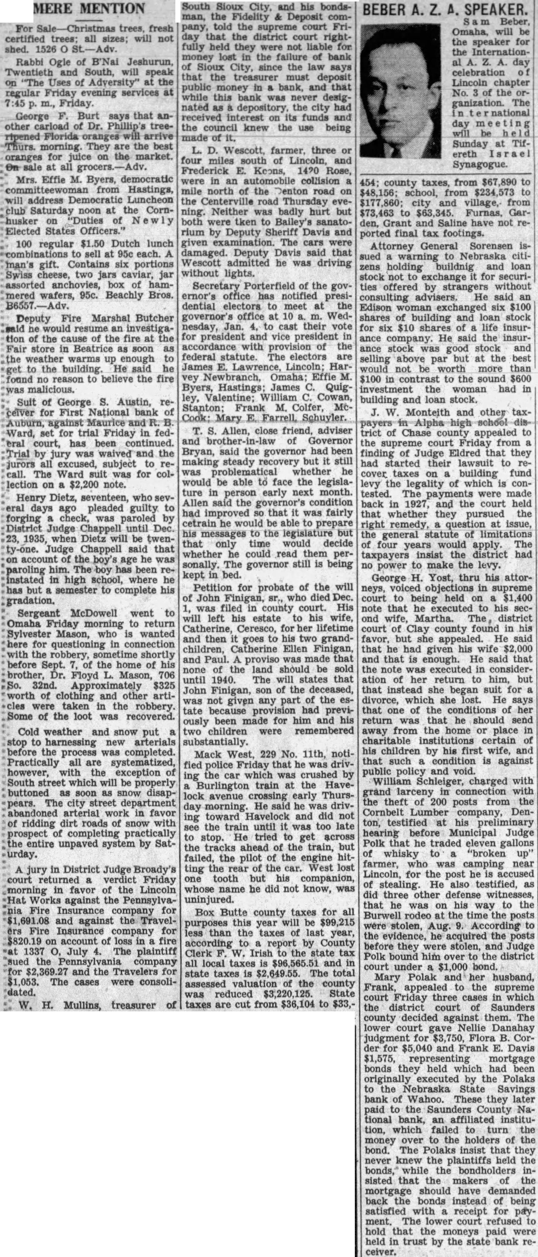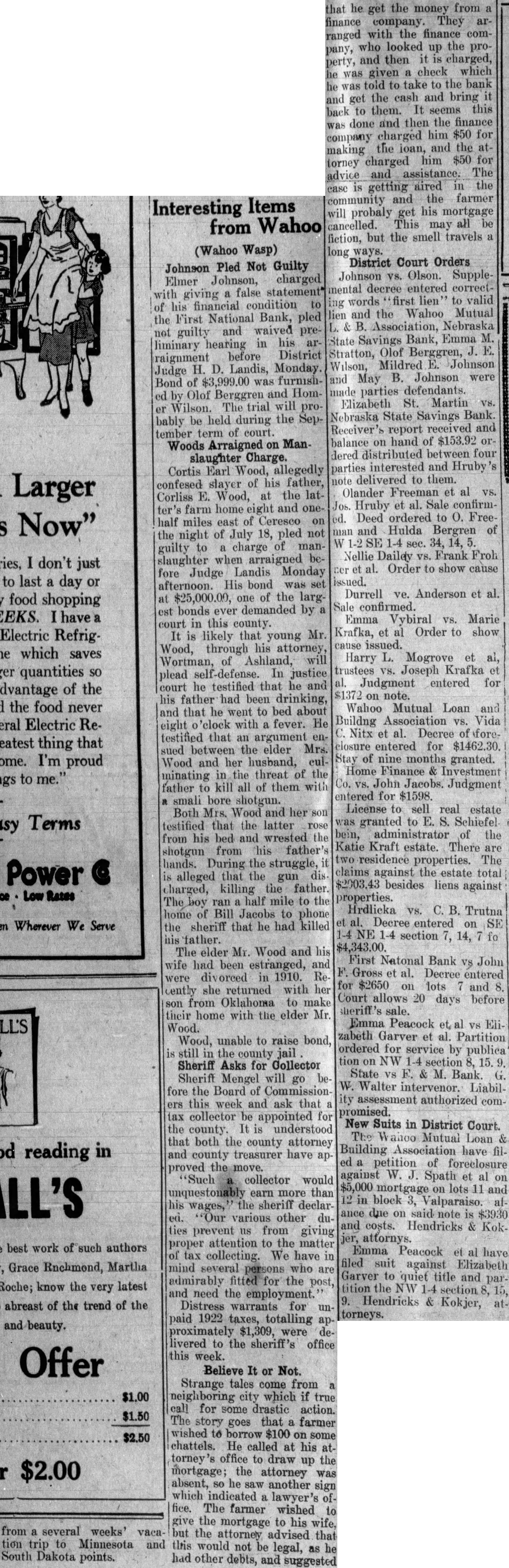 COUNTY SEAT NEWS (Wahoo Wasp) The Saunders County Farm Bureau, through their attorneys, Schiefelbein & Donato, filed an appeal in the district court last Monday in the question of the right to have Farm Bureau bolloted on at the election Tuesday. Judge Landis held a conference Tuesday with the interested parties and the question will go on the ballot. Nellie Barry, as administratrix of the estate of Margaret Barry, has filed suit against Anton Krafka, Edna M. Krafka, Frank Podhaisky, George H. Cronkleton, receiver of the Saunders County National Bank, and E. H. Luikhart, receiver of the Nebraska State Savings Bank for two notes and mortgages for $3000 each. Chas. H. Slama, attorney. E. S. Schiefelbein has filed petition against Leo May et al on taxes on lot 2, block 2, Memphis. Fremont National Bank has filed suit against John Henkens on note of $1200. Inez Pollard Mannbeck has filed a suit against Thomas O. Pollard for an accounting of rents and profits from her farm since October 4, 1924. Petition charges that her grandfather gave her the W 1-2 of SE 1-4 Section 7, 12, 9 on the above date when she was a minor. The defendant, her father, took charge of her property without taking out lei ters of guardianship and has made no accounting. Chas. E. Shotwell and Frank E Childs have filed suit in equity against Clara Ruzicka, minor, above the age of 14 years, et al on Section 16,1 and 21, all in township 16, 9, J. H. Barry, attorney. Decrees Entered. W. H. Sutton vs Herman Bostrom. Decree entered. First and third cause dismissed. Plaintiff's second cause allowed, and cross petition Mary Jane Doom is allowed as second lien and fourth lien allowed plaintiff on SE 1-4 33, 16, 8. Faustin Bor VS Eleanor plaintiff has first lien of $2,134.16, Dwight State Bank receiver has second lien of $2,345, and First National Bank as administrator of Ellen Taylor estate $1391 as third lien. Judgment Given Luther College Judge L. S. Hastings was in Wahoo on Wednesday and handed down a decision in a very important case which was tried in July before the court and taken under advisement. Briefs were prepared by attorneys on both sides and submitted to the court. The case had to do with the bank failures in Wahoo. Emil Benson was treasurer of Luther College and embezzled something around $19,811. This discovery was made when the Citizens State Bank was closed in the spring of 1930. Benson was an officer of the bank also. Luther College sued Benson and American Surety Co., who was his bondsmen, for the full amount of their bond of $10000 The court's entry on the dockets is as follows: Finding generally for plaintiff, and that the plaintiff is entitled to recover from the defendants the sum of $10,000 with 7 per cent interest thereon from Sept. 7, 1930, and an attorney fee for plaintiff's attorney of $700 and costs of suit. Judgment was rendered against both defendants for $10,000 and interest, but the attorney fees are against the American Surety Co., only. Hendricks and Kokjer were attorneys for Luther College. District Court Notes Saunders County Farm Bureau. through their attorneys Schiefelbein and Donato, filed an appeal in the District Court last Monday in the question of the right to have theFarmAgent balloted on at the election next Tuesday. Judge Landis held a conference with the interested parties and the question will go on the ballot. Nellie Barry, as administratrix of the estate of Margaret Barry, deceased, has filed suit against Anton Krafka, Edna M. Krafka, Frank Podhaisky, George C. Cronkelton as receiver of the Saunders County National Bank and E. H. Luikart, receiver of the Nebraska State Savings Bank for two notes and mortgages for $3000 cach. Chas. H. Slama, atty. E. S. Schiefelbein has filed petition against Leo May, et al on taxes on Lot 2, Block 2, Memphis. Fremont National Bank has filed suit against John Henkcns on note of $1200. Inez Pollard Mannbeck has filed suit against Thomas O. Pollard, for an accounting of rents and profits of her farm, since October 4, 1924. Petition harges that her grandfather gave her W1-2 SE1-4, See 7, 12, 9, on above date while she was a minor. The defendant, her father took charge of her property without taking out letters of guardianship and has made no accounting. Chas. E. Shotwell and Frank E. Childs have filed suit in eqmy against Clara Ruzicka, minor, above theage of 14 yrs et al, on Sec. 16, 17, and 21, all in township 16 ,9 J. H. Barry, atty. (Courtright, Sidner, Lee & Gunderson, Attorneys)