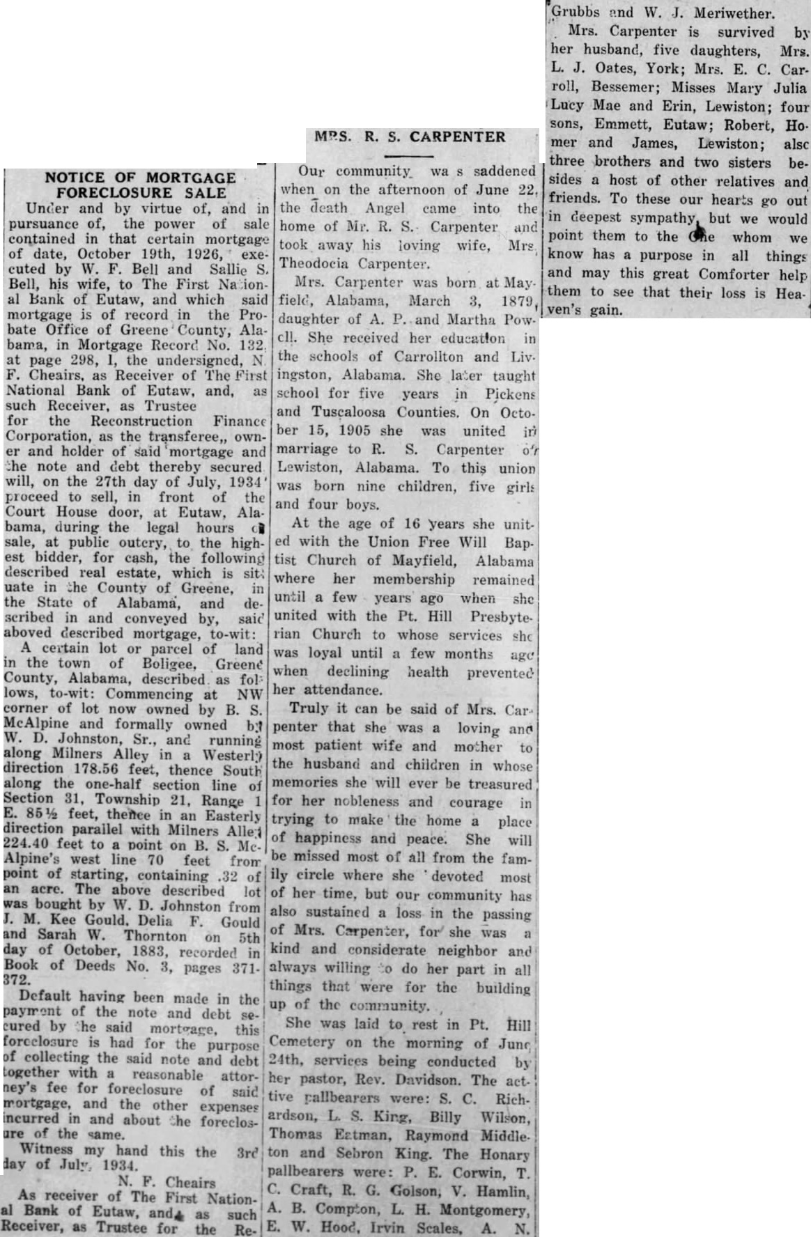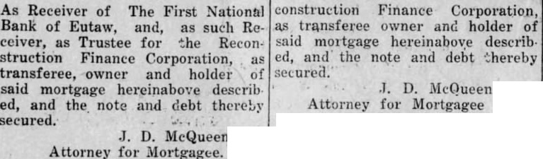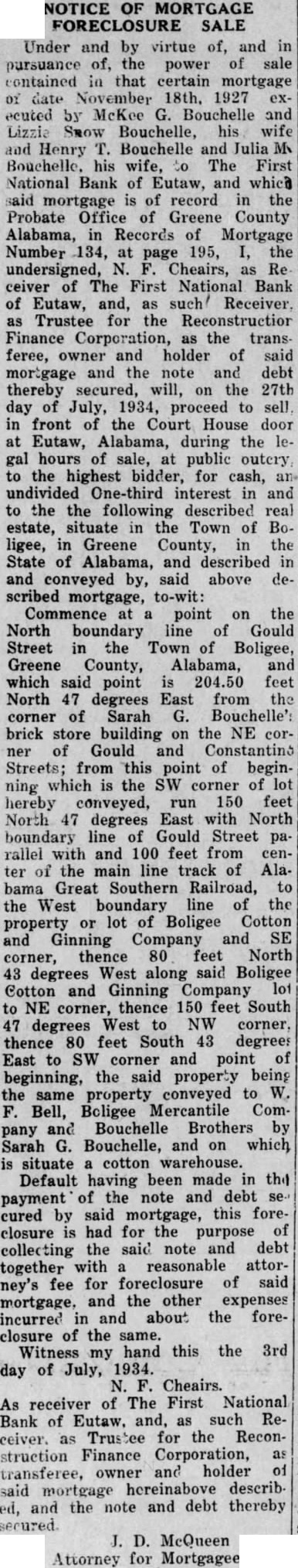 NOTICE OF MORTGAGE FORECLOSURE SALE Under and by virtue of, and in pursuance of, the power of sale contained in that certain mortgage of date November 18th, 1927 executed by McKee G. Bouchelle and Lizzie Snow Bouchelle, wife and Henry T. Bouchelle and Julia Ms Bouchelle, his wife, The First National Bank of Eutaw, and which said mortgage is of record in the Probate Office of Greene County Alabama, in Records of Mortgage Number 134, at page 195, the undersigned, N. Cheairs, as Re ceiver of The First National Bank of Eutaw, and, as such! Receiver. as Trustee for the Reconstructior Finance Corporation, as the transferee, owner and holder of said mortgage and the note and debt thereby secured, will, on the 27th day of July, 1934, proceed to sell in front the Court House door at Eutaw, Alabama, during the gal hours of sale, at public outery to the highest bidder, for cash, undivided One-third interest in and to the the following described real estate, situate in the Town of Boligee, in Greene County, in the State of Alabama, and described in and conveyed by, said above described mortgage, to-wit: Commence at point on the North boundary line of Gould Street in the Town of Boligee, Greene County, Alabama, which said point is 204.50 feet North 47 degrees East from the corner of Sarah G. Bouchelle's brick store building on the NE corner of Gould and Constantino Streets; from this point of beginning which is the SW corner of lot hereby conveyed, run 150 feet North 47 degrees East with North boundary line of Gould Street parallel with and 100 feet from center of the main line track of Alabama Great Southern Railroad, to the West boundary line of the property or lot of Boligee Cotton and Ginning Company and SE corner, thence 80 feet North 43 degrees West along said Boligee Cotton and Ginning Company lot to NE corner, thence 150 feet South 47 degrees West to NW corner. thence 80 feet South 43 degrees East to SW corner and point of beginning, the said property being the same property conveyed to W. Bell, Boligee Mercantile Company and Bouchelle Brothers by Sarah G. Bouchelle, and on which is situate cotton warehouse. Default having been made in the payment of the note and debt cured by said mortgage, this foreclosure had for the purpose of collecting the said note and debt together with reasonable attorney's fee for foreclosure of said mortgage, and the other expenses incurred in and about the foreclosure of the same. Witness my hand this the 3rd day of July, 1934. Cheairs. As receiver of The First National Bank of Eutaw. and, as such Receiver. as Trustee for the Reconstruction Finance Corporation, transferee, owner and holder said mortgage hereinabove describand the note and debt thereby ed, J. D. McQueen Attorney for Mortgagee