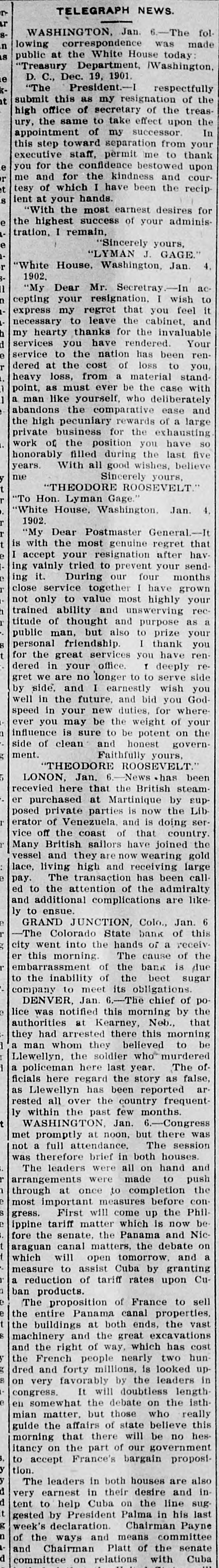 r TELEGRAPH NEWS. r WASHINGTON Jan 6 The folin lowing correspondence was made is public at the White House today "Treasury Department, Washington, ie D. C., Dec. 19, 1901 k"The President.- respectfully t submit this as my resignation of the high office of secretary of the treasury, the same to take effect upon the In appointment of my successor this step toward separation from your executive staff, permit me to thank e you for the confidence bestowed upon r for the kindness and court tesy me and of which I have been the recipient at your hands. "With the most earnest desires for e the highest success of your adminis tration, I remain, e Sincerely yours, "LYMAN J. GAGE. 4. r "White House, Washington, Jan. 1902. 1 "My Dear Mr. Secretray. ac n cepting your resignation, I wish to express my regret that you feel it necessary to leave the cabinet, and h my hearty thanks for the invaluable Your services you have rendered. e service to the nation has been rendered at the cost of loss to you, heavy loss, from a material stand point, as must ever be the case with a man like yourself, who deliberately abandons the comparative ease and the high pecuniary rewards of a large private business for the exhausting work of the position you have so honorably filled during the last five years. With all good wishes, believe me Sincerely yours, "THEODORE ROOSEVELT "To Hon. Lyman Gage. "White House. Washington, Jan. 4. 1902. "My Dear Postmaster General.-It t with the most genuine regret that I is accept your resignation after having vainly tried to prevent your send it. During our four months service together I to value most not ing close only have highly grown your trained ability and unswerving rec- a titude of thought and purpose as public man, but also to prize your personal friendship I thank you for the great services you have ren redered in your office. I deeply gret we are no 'longer to to serve side side. and I earnestly wish God you well by in the future, and bid you speed in your new duties, for where ever you may be the weight of your the influence is sure to be potent govern on side of clean and honest ment. g Faithfully yours, "THEODORE ROOSEVELT. LONON, Jan. 6. News .has been recevied here that the British steam purchased at Martinique by sup- Lib posed er private parties is now the erator of Venezuela and is doing country. service off the coast of that the Many British sailors have joined gold vessel and they now wearing large lace, living high and receiving call The transaction has been pay. the attention of the admiralty like and ed to additional complications are ly to ensue. GRAND JUNCTION, Colo., Jan. this 6 Colorado State bank of receiv-The went into the hands of a of the city morning The cause embarrassment er this of the bank is sugar due the inability of the beet to to meet its obligations. of company DENVER, Jan. 6.-The chief the powas notified this morning by that authorities lice at Kearney, Neb., had arrested there this morning to be they whom they believed murdered Llewellyn, a man the soldier The of policeman here last year. ficials a here regard the story reported as false, aras Llewellyn has been frequent all over the country months rested within the past few ly WASHINGTON Jan. 6.-Congress there was promptly at noon, but session met full attendance. The houses. not a therefore brief in both and was were all on hand The leaders made to push arrangements were the at once to completion congress. through important measures before the Phil which most First will come up is now be ippine tariff matter the Panama and Nic fore the senate, canal matters, the debate and on a araguan will open tomorrow, a which to assist Cuba by granting Cua measure reduction of tariff rates upon products. ban proposition of France to sell The Panama canal properties. vast the the great the buildings entire at both ends, excavations the machinery and of way, which has cost and the right people nearly two hun up the French millions, is looked dred and forty by the leaders in It on very favorably will doubtless length isth congress. somewhat the debate on who the really eu but those this mian matter. affairs of state believe hes guide the that there will be no to accept itancy morning on the France's part of bargain our government proposiy d tion. leaders in both houses desire are and also ind very The earnest in their on the line sug it tent to help President Cuba Palma in his Payne last gested week's by declaration. means Chairman committee of the ways and Platt of the senate d Cuba and committee Chairman on relations with