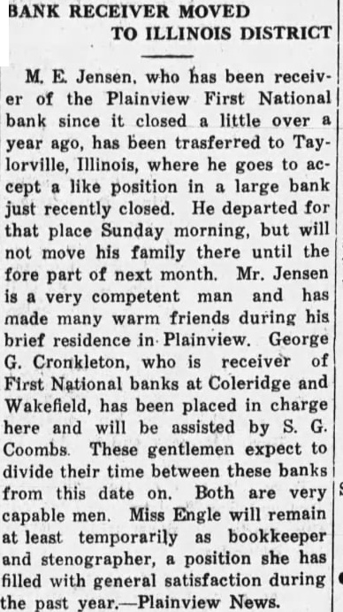 BANK RECEIVER MOVED TO ILLINOIS DISTRICT M. E. Jensen, who has been receiver of the Plainview First National bank since it closed a little over a year ago, has been trasferred to Taylorville, Illinois, where he goes to accept a like position in a large bank just recently closed. He departed for that place Sunday morning, but will not move his family there until the fore part of next month. Mr. Jensen is a very competent man and has made many warm friends during his brief residence in Plainview. George G. Cronkleton, who is receiver of First National banks at Coleridge and Wakefield, has been placed in charge here and will be assisted by S. G. Coombs These gentlemen expect to divide their time between these banks from this date on. Both are very capable men. Miss Engle will remain at least temporarily as bookkeeper and stenographer, a position she has filled with general satisfaction during the past year.-Plainview News.