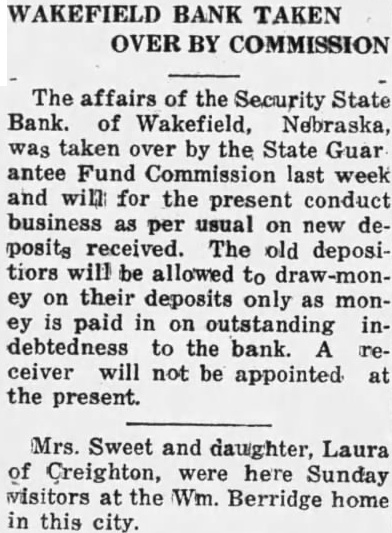 The affairs of the Security State Bank. of Wakefield, Nebraska, was taken over by the State Guar antee Fund Commission last week and will for the present conduct business as per usual on new deposits received. The old depositiors will be allowed to draw-money on their deposits only as money is paid in on outstanding indebtedness to the bank. A receiver will not be appointed at the present.