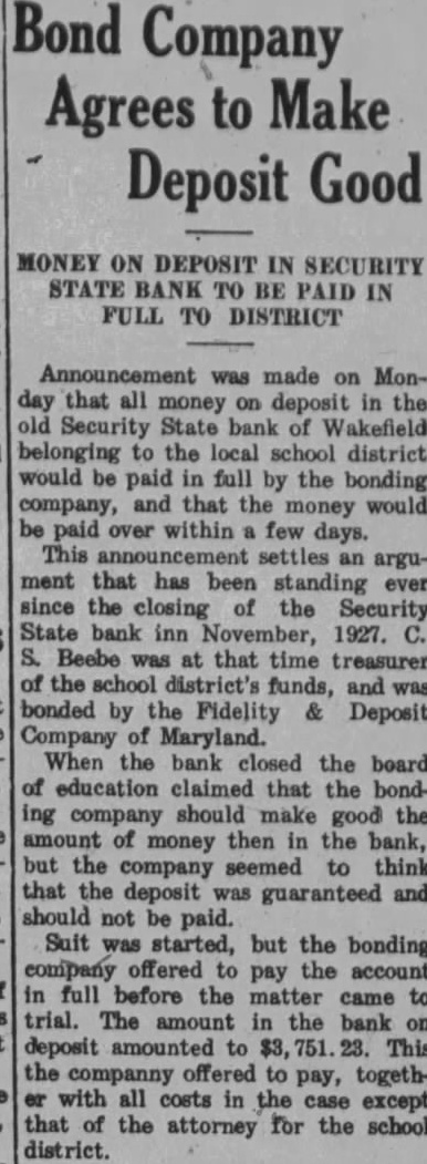 Announcement was made on Monday that all money on deposit in the old Security State bank of Wakefield belonging to the local school district would be paid in full by the bonding company, and that the money would paid over within few days. This an argument that has been standing ever since the closing of the Security State bank inn November, 1927. Beebe was at that time treasurer of the school district's funds, and bonded by the Fidelity Deposit Company of Maryland. When the bank closed the board of education claimed that the bonding company should make good the amount of money then in the bank, but the company seemed to think that the deposit was guaranteed and should not be paid. Suit was started, but the bonding company offered to pay the account in full before the matter came to trial. The amount in the bank on deposit to This the companny offered to pay, togethwith all costs in the case except that of the attorney for the school district.