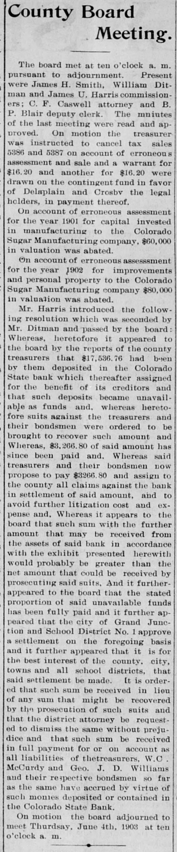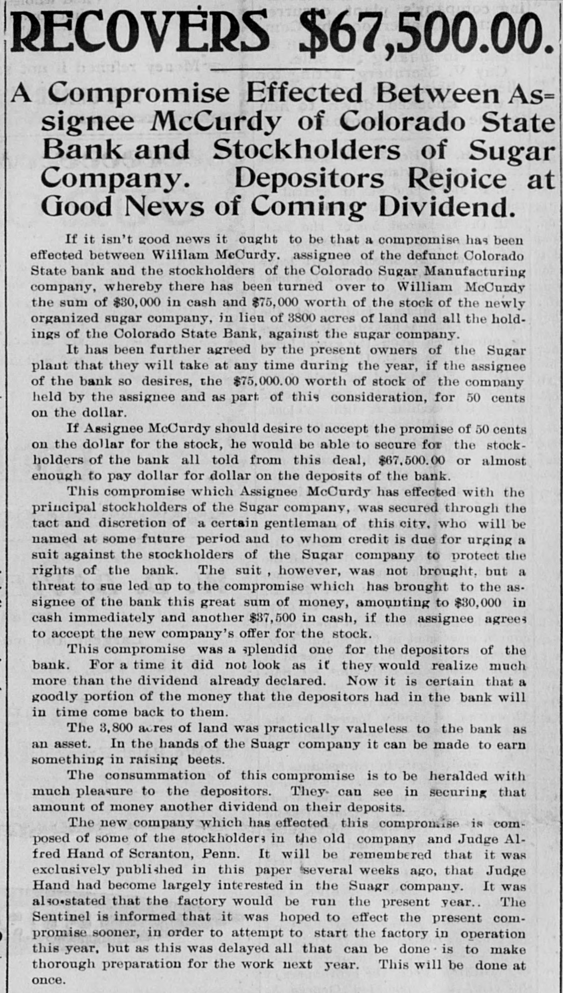 RECOVERS $67,500.00. A Compromise Effected Between As= signee McCurdy of Colorado State Bank and Stockholders of Sugar Company. Depositors Rejoice at Good News of Coming Dividend. If it isn't good news it ought to be that a compromise has been effected between Wililam McCurdy. assignee of the defunct Colorado State bank and the stockholders of the Colorado Sugar Manufacturing company, whereby there has been turned over to William McCurdy the sum of $30,000 in cash and $75,000 worth of the stock of the newly organized sugar company, in lieu of 3800 acres of land and all the holdings of the Colorado State Bank, against the sugar company. It has been further agreed by the present owners of the Sugar plant that they will take at any time during the year, if the assignee of the bank so desires, the $75,000.00 worth of stock of the company held by the assignee and as part of this consideration, for 50 cents on the dollar. If Assignee McCurdy should desire to accept the promise of 50 cents on the dollar for the stock, he would be able to secure for the stockholders of the bank all told from this deal, $67,500.00 or almost enough to pay dollar for dollar on the deposits of the bank. This compromise which Assignee McCurdy has effected with the principal stockholders of the Sugar company, was secured through the tact and discretion of a certain gentleman of this city, who will be named at some future period and to whom credit is due for urging a suit against the stockholders of the Sugar company to protect the rights of the bank. The suit, however, was not brought, but a threat to sue led up to the compromise which has brought to the assignee of the bank this great sum of money, amounting to $30,000 in cash immediately and another $37,500 in cash, if the assignee agrees to accept the new company's offer for the stock. This compromise was a splendid one for the depositors of the bank. For a time it did not look as it they would realize much more than the dividend already declared. Now it is certain that a goodly portion of the money that the depositors had in the bank will in time come back to them. The 3,800 acres of land was practically valueless to the bank as an asset. In the hands of the Suagr company it can be made to earn something in raising beets. The consummation of this compromise is to be heralded with much pleasure to the depositors. They can see in securing that amount of money another dividend on their deposits. The new company which has effected this compromise is composed of some of the stockholder in the old company and Judge Alfred Hand of Scranton, Penn. It will be remembered that it was exclusively published in this paper several weeks ago, that Judge Hand had become largely interested in the Suagr company. It was alsostated that the factory would be run the present year. The Sentinel is informed that it was hoped to effect the present compromise sooner, in order to attempt to start the factory in operation this year, but as this was delayed all that can be done is to make thorough preparation for the work next year. This will be done at once.
