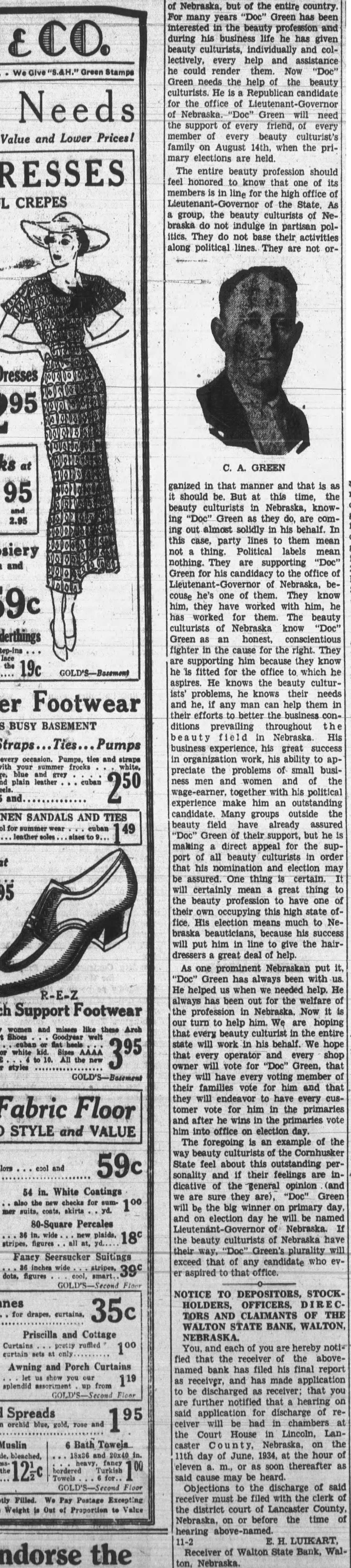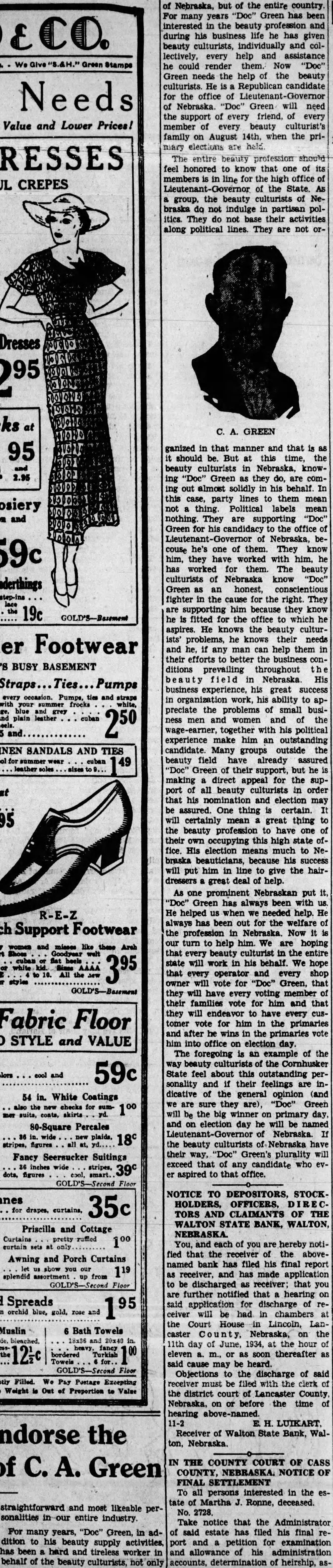 of Nebraska, but of the entire country. For many years "Doc" Green has been interested in the beauty profession and during his business life he has given beauty culturists, individually and collectively, every help and assistance We Give "S.&H." Green Stamps he could render them. Now "Doc" Green needs the help of the beauty culturists. He is a Republican candidate for the office of Lieutenant-Governor of Nebraska. "Doc" Green will need the support of every friend, of every Value and Lower Prices! member of every beauty culturist's family on August 14th, when the primary elections are held. The entire beauty profession should feel honored to know that one of its members is in line for the high office of Lieutenant-Governor of the State, As a group, the beauty culturists of Nebraska do not indulge in partisan politics. They do not base their activities along political lines. They are not or- ganized in that manner and that is as 95 it should be. But at this time, the beauty culturists in Nebraska, knowand 2.95 ing "Doc" Green as they do, are coming out almost solidly in his behalf. In this case, party lines to them mean not a thing. Political labels mean nothing. They are supporting "Doc" and Green for his candidacy to the office of Lieutenant-Governor of Nebraska, becouse he's one of them. They know him, they have worked with him, he has worked for them. The beauty culturists of Nebraska know "Doc" Green as an honest, conscientious fighter in the cause for the right. They are supporting him because they know the 19c he is fitted for the office to which he aspires. He knows the beauty culturists' problems, he knows their needs and he, if any man can help them in their efforts to better the business conditions prevailing throughout the beauty field in Nebraska. His Ties Pumps business experience, his great success Styles for every occasion. Pumps, ties and straps in organization work, his ability to apwhite, preciate the problems of small business men and women and of the wage-earner, together with his political experience make him an outstanding candidate. Many groups outside the LINEN SANDALS AND TIES beauty field have already assured So cool for summer wear euban 49 heels leather soles sises to "Doc" Green of their support, but he is making a direct appeal for the support of all beauty culturists in order that his nomination and election may be assured. One thing is certain. It will certainly mean a great thing to 95 the beauty profession to have one of their own occupying this high state office. His election means much to Nebraska beauticians, because his success will put him in line to give the hairdressers a great deal of help. As one prominent Nebraskan put it, "Doc" Green has always been with us. He helped us when we needed help. He R-E-Z always has been out for the welfare of Arch Support Footwear the profession in Nebraska. Now it is our turn to help him. We are hoping women and misses like these Arch that every beauty culturist in the entire Shoes Goodyear welt or heels state will work in his behalf. We hope 295 black or white kid. Sizes AAAA that every operator and every shop 10. All the new owner will vote for "Doc" Green, that GOLD'S-Basement they will have every voting member of their families vote for him and that they will endeavor to have every customer vote for him in the primaries and after he wins in the primaries vote him into office on election day. The foregoing is an example of the way beauty culturists of the Cornhusker 59c State feel about this outstanding perand sonality and if their feelings are indicative of the general opinion (and 54 in. White Coatings we are sure they are), "Doc" Green also the new checks for sum- 1°° will be the big winner on primary day, mer suits, conts, skirts yd. and on election day he will be named 80-Square Percales Lieutenant-Governor of Nebraska. If 36 in. wide new 18c the beauty culturists of Nebraska have stripes, figures all at, their way, "Doc" Green's plurality will Fancy Seersucker Suitings exceed that of any candidate who ev36 inches wide stripes, 39° er aspired to that office. dots, figures cool, smart. NOTICE TO DEPOSITORS, STOCKHOLDERS, OFFICERS, D TORS AND CLAIMANTS OF THE WALTON STATE BANK, WALTON, NEBRASKA. You. and each of you are hereby notified that the receiver of the abovenamed bank has filed his final report as receiver, and has made application to be discharged as receiver; that you are further notified that a hearing on said application for discharge of receiver will be had in chambers at the Court House in Lincoln, Lancaster Nebraska, on the 11th day of June, 1934, at the hour of eleven a. m., or as soon thereafter as said cause may be heard. Objections to the discharge of said receiver must be filed with the clerk of the district court of Lancaster County, Nebraska, on or before the time of hearing above-named. 11-2 E. H. LUIKART, Receiver of Walton State Bank, Walton, Nebraska.